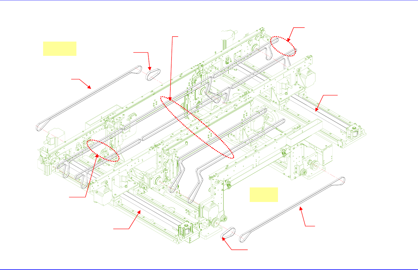 Conveyor & BUT 5-35 5.4.5. Conveyor Belt 位置及名称 自动宽度调节用 T iming Belt 宽度调节同步 T iming Belt Exit Shuttle Flat Belt 宽度调节同期化 T iming Belt Exit Shuttle Flat Belt W ork Zone Flat Belt 自动宽度调节用 T iming Belt Shuttle T iming Bel…