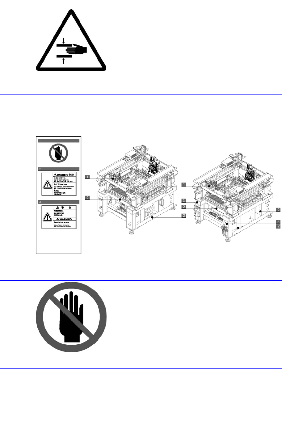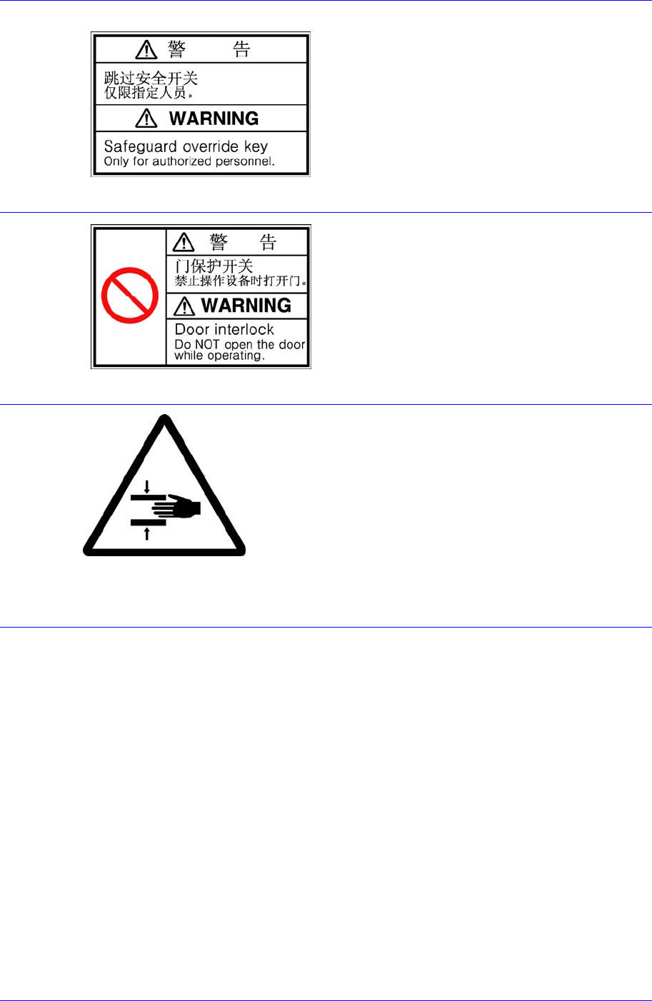 前言 v 设备后面 设备后面贴有以下标签 图 0-2. 设备后面的安全标 签 盖内侧及周围连接物部位 存在高电压要注意 电击危险。 在维护和修理设备操作时 一定要先切断主电 源。 运行中请勿打开门 贴有此标签处有移动体,驱动中 打开门把身 体的一部份伸进设备内部时非常 危险。