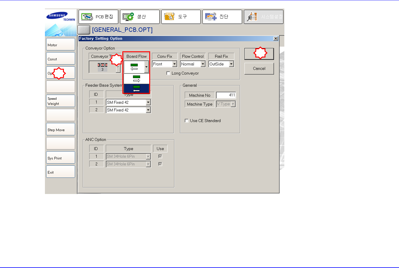 10. 在System Setup Factory菜单中选择Option辅助菜单后,在‘Factory Setting Option’对话框中选择想要变更的PCB Flow。