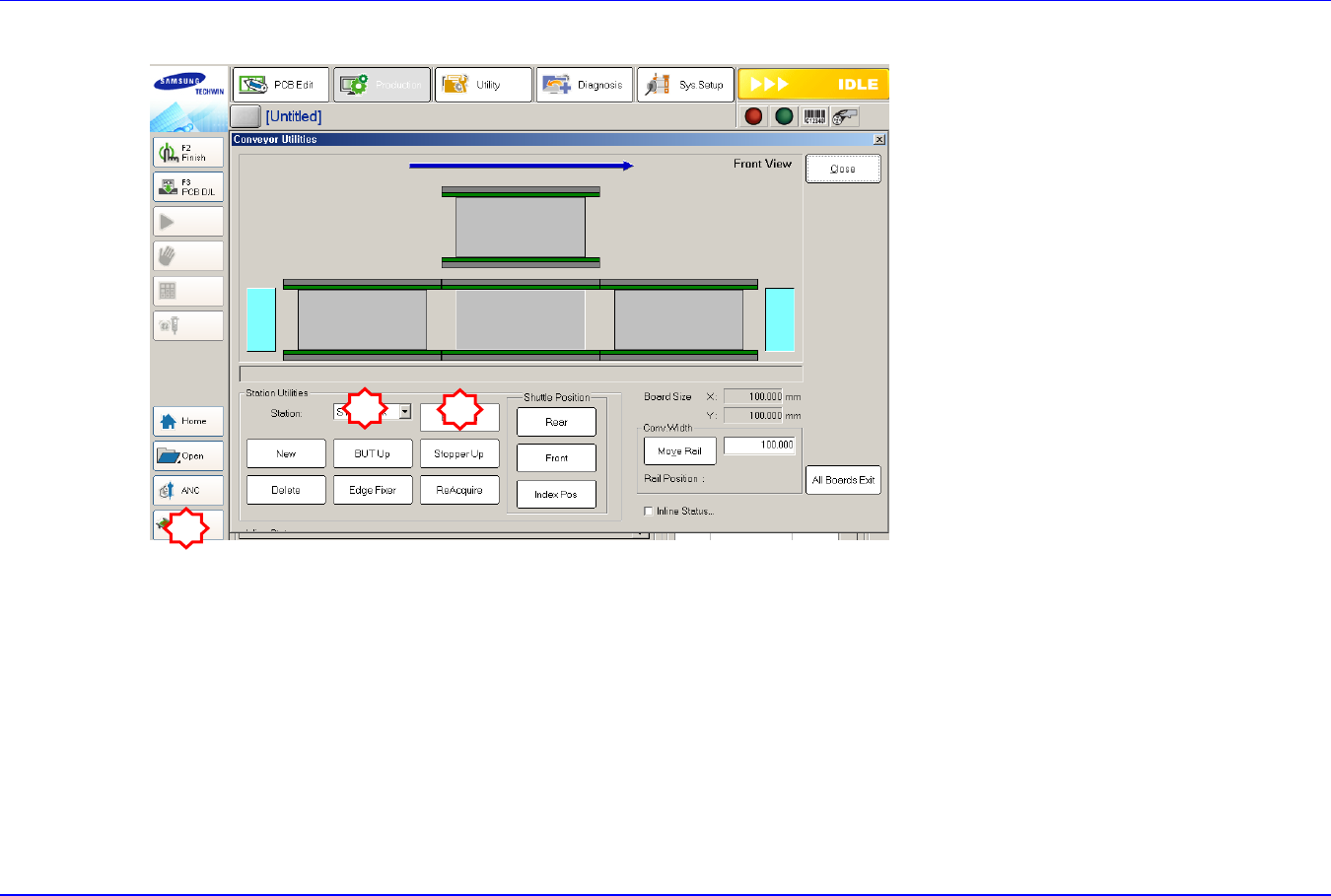12. ‘请执行‘Conveyor Utilities’对话框。投入PCB后确认各Station的基板传感器及Stopper是否正常工作。