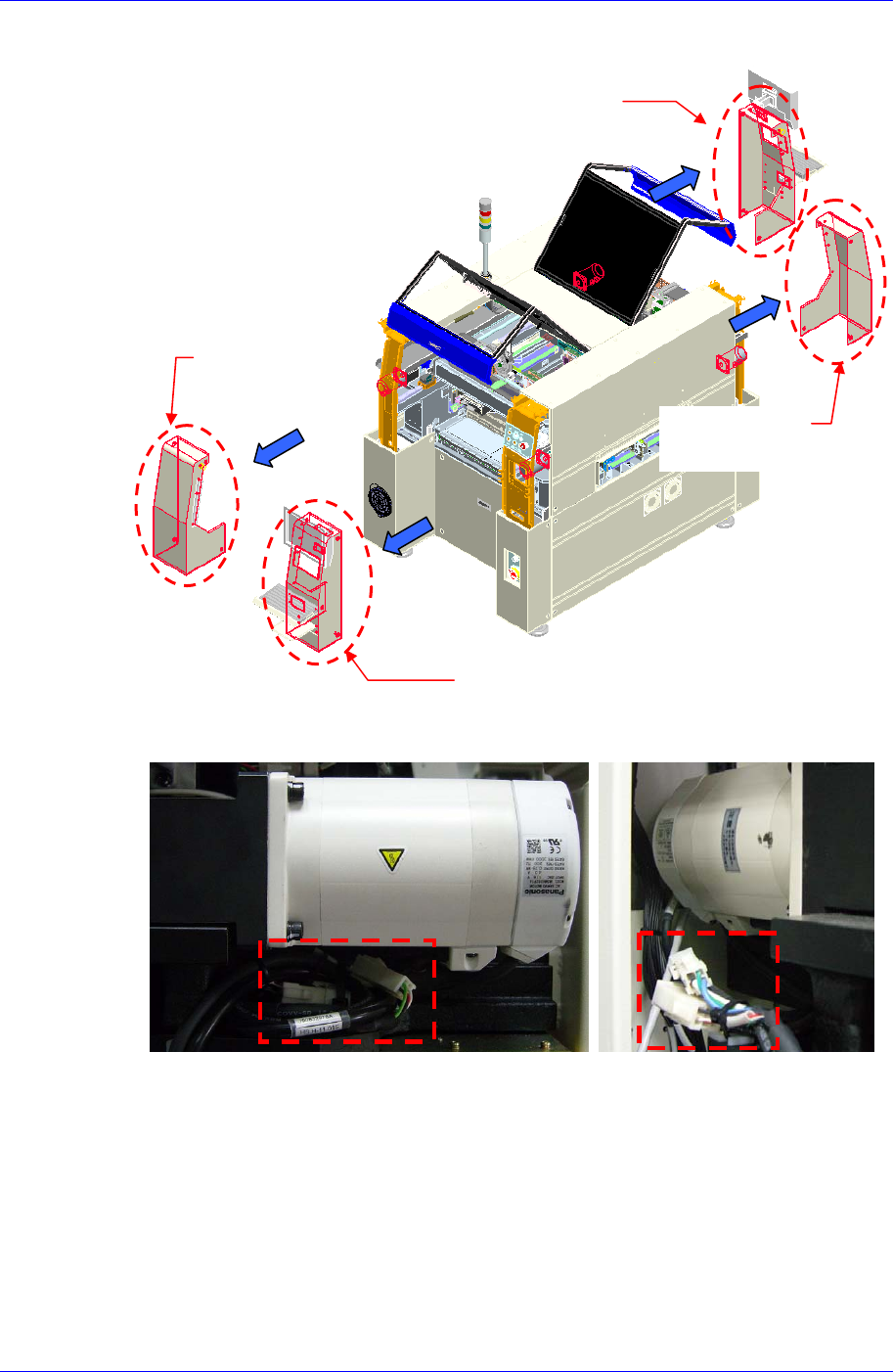 Samsung Component Placer SM431 Service Manual 6-24 1. 按 ‘Feeder Change’ 把 ‘Front/Rear X Frame 如下图所示进行移 动。 2. 关闭设备电源。 3. 为了拆卸 Upper Cover 请拆卸各种显示器、鼠标 、键盘的线。 4. 为了拆卸左 / 右侧的 Front, Rear Upper Cover 利用十字形螺丝刀( + )拧 开各 Upper C…