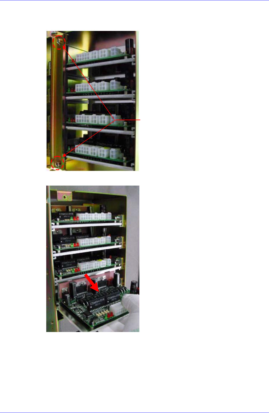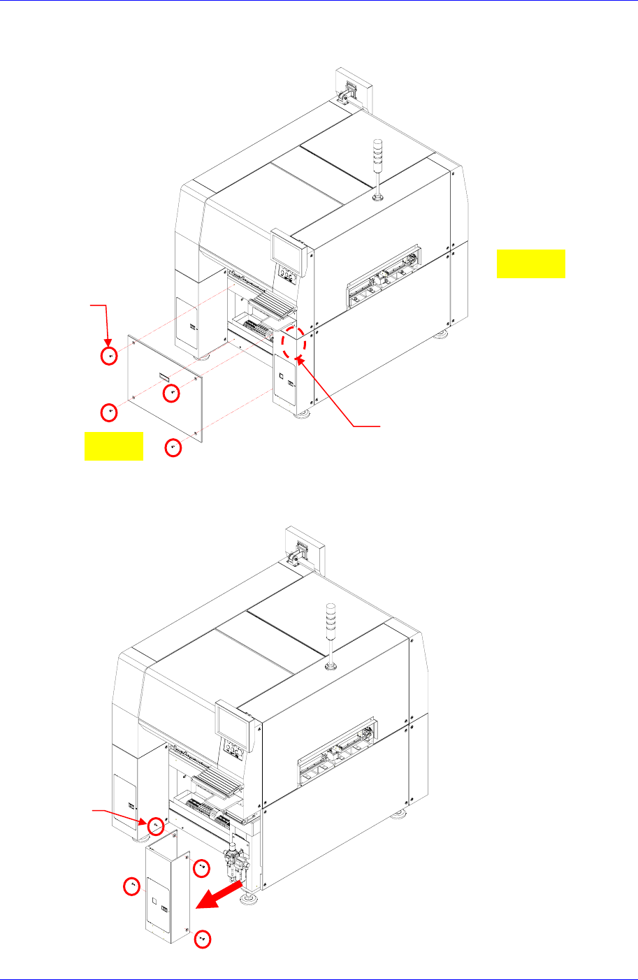 Boar d 13-23 2. 利用十字形螺丝刀 (+) 拧开固定设备背面 Cover 的固定螺丝 (4-M5*30 后拆卸 Cover 。 3. 用十字形螺丝刀( + )拧开设备背 面右侧固定 Cover 的固定螺丝后,拆卸左侧的 Cover . 。 圆头螺丝 (4-M5*15) Rear Front Conveyor Step Diver 圆头螺丝 (4-M5*15)