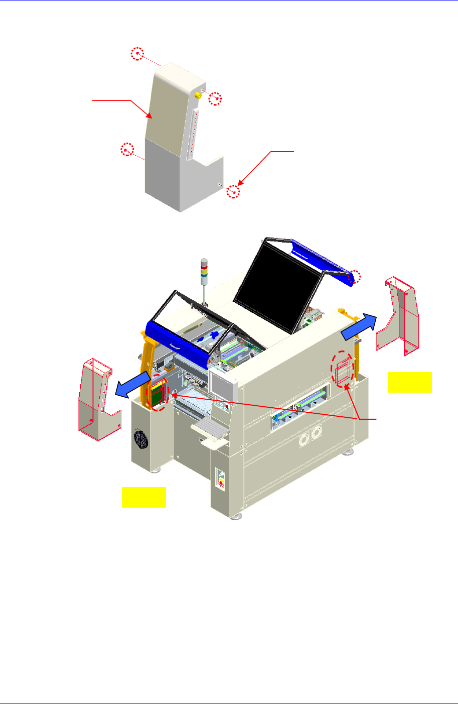 图中固定Upper Cover的4个固定螺丝后把Upper Cover按箭头方向进行拆卸。
