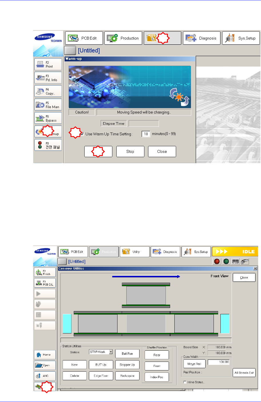 3. 在‘Conveyor Utilities’对话框投入PCB,确认各Station的基板检查传感器及其他