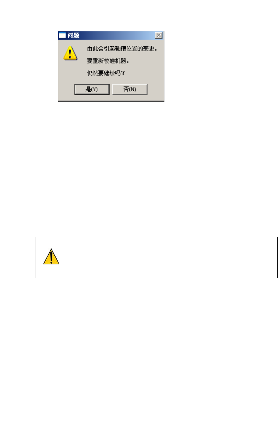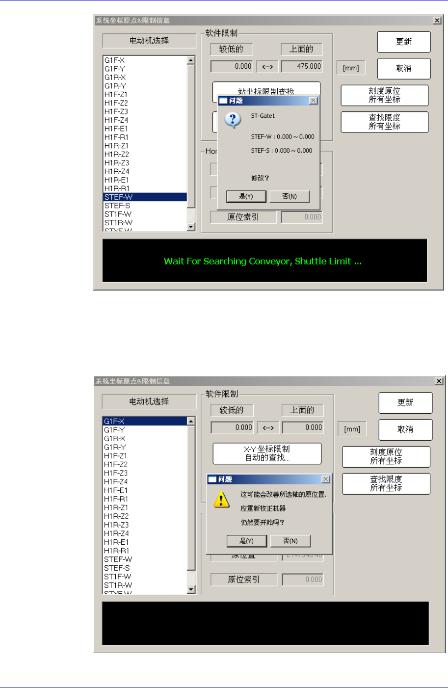 Calibration 3-5 < 校准原位 > 按钮 自动查找和反应 < 电动机选择 > 目录框中选 定的马达 home 位置。 在目录框自动搜索所选马达 HOME 位置并反应其值。点击此按钮则显示 “ HOME 位置可能会变更”警告信息窗。如果要重新搜索所选马达 HOME 位置请点击 <Y> 按钮。