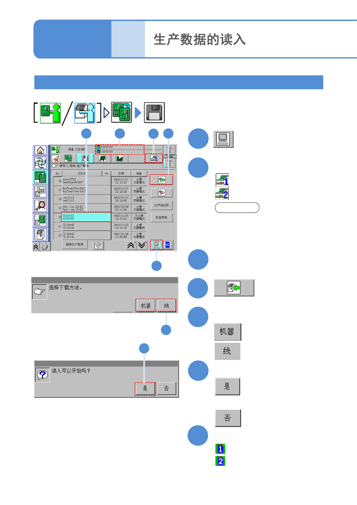 NPM-TT2 EJM1EC-MB-02O-00 文件 操作 2 操作篇 2 - 3 - 3 2-3-3 -3 1 2 6 3 选择读取处 确认提示 分别读取轨道 1 、轨道 2 的生产 数据。即使在属于相同种类 的情形下,也请分别读取生产数据 。 :设备单体 :生产线整体 5 选择文件 6 ■不读入时 选择轨道 4 :轨道 1 :轨道 2 7 确认数据 :轨道 1 生产数据的名称 :轨道 2 生产数据的名称 注意 ●当只在单侧进行生产…