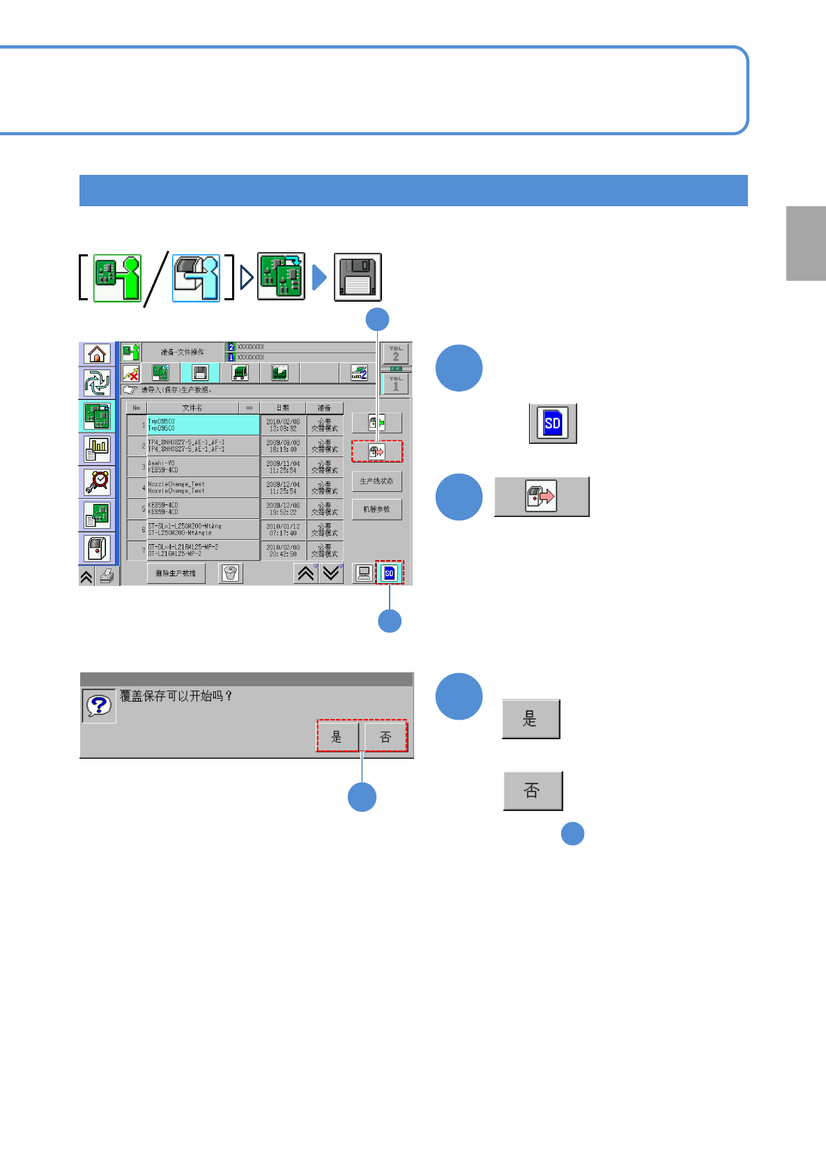 NPM-TT2 EJM1EC-MB-02O-00 文 件 操作 操作篇 2 - 3 - 5 2-3-5 -1 在这里对删除双轨模式 生产数据的方法进行说明。 1 2 1 2 选择轨道 :轨道 1 :轨道 2 4 :轨道 1 的生产数据名称 :轨道 2 的生产数据名称 3 确认提示 4 3 ■不想删除数据时 确认所删除数据名称已经消失