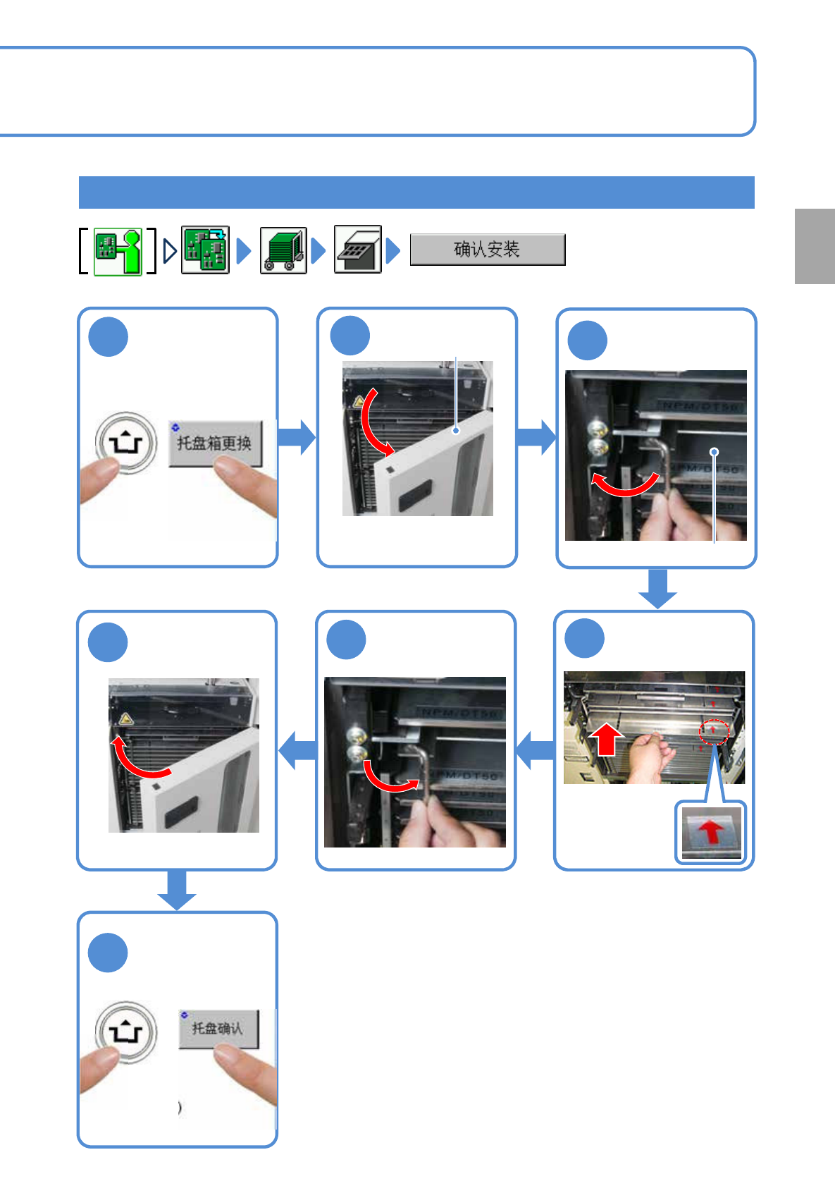 NPM-TT2 EJM1EC-MB-02O-00 在托盘箱设置托盘板 2 6 5 3 4 对托盘板解锁 插入托盘板 上锁 ●门被锁住时。 ( → P.2-4-3) 托盘箱门 托盘板 ●注意方向。 2-4-2 -2 1 ACTIVATION 7 ACTIVATION ( 更新安装状态 )