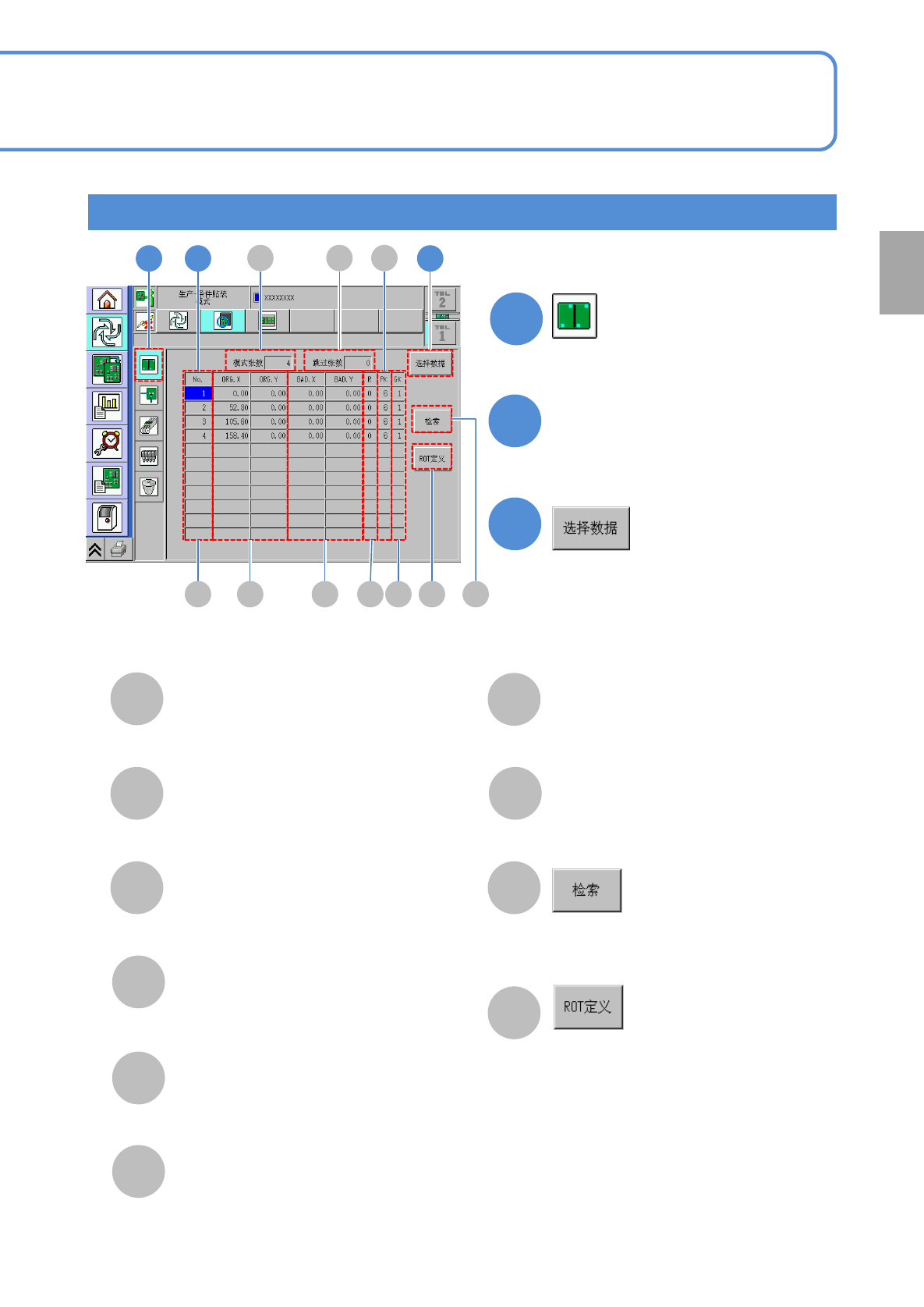 NPM-TT2 EJM1EC-MB-02O-00 2 1 1 2 选择图案 ●可以复数选择。 3 3 ●再按一次,选择就被 解除。 E F C D I 2-5-6 -2 A E F G B C D I J H 图案张数 图案的总数。 跳过张数 指定跳过的图案总数。 No. 模式的 ID 编号。 ORG.X/ORG.Y 原点图案的 X/Y 坐标 BAD.X/BAD.Y 不良图案的 X/Y 坐标 R 图案的展开角度编号 PK 图案编号 H …