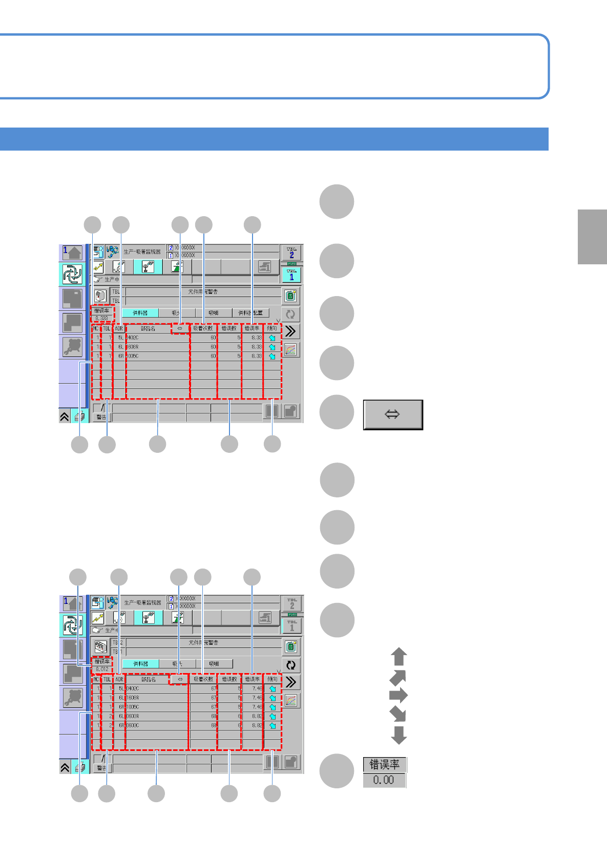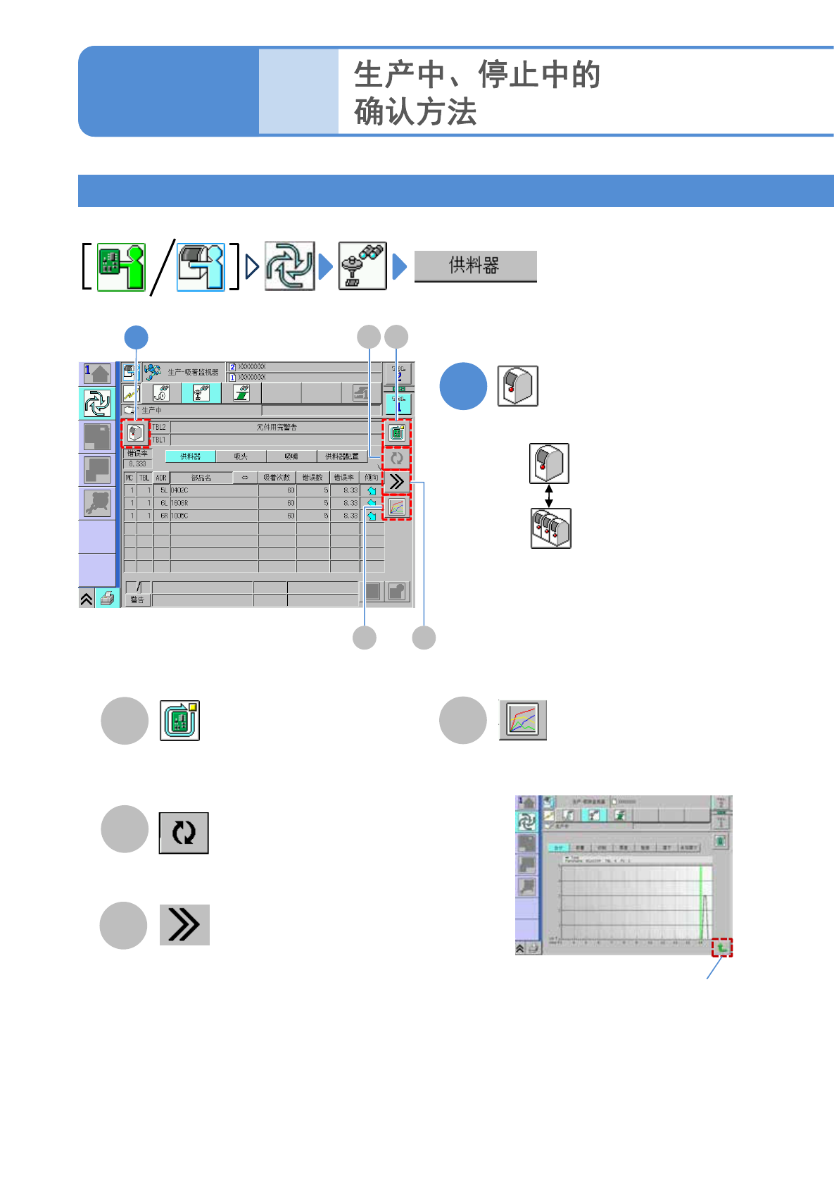 NPM-TT2 EJM1EC-MB-03O-00 料架吸着状况 1 4 操作篇 3 - 2 - 1 选择设备单位或者生产 线单位。 : 设备单位 : 生产线单位 3-2-1 -7 生 产 信 息 A 生产中的基板在生产后 ,再停止生产。 ( → P.3-1-2) B 更新为最新信息。 D 显示吸着信息的详细内容。 C ●所选择的吸嘴在 1 小时左右的错误次 数通过图表来显示。 竖轴 : 错误次数 横轴 : 时间 返回 原来画面时 ●显示…