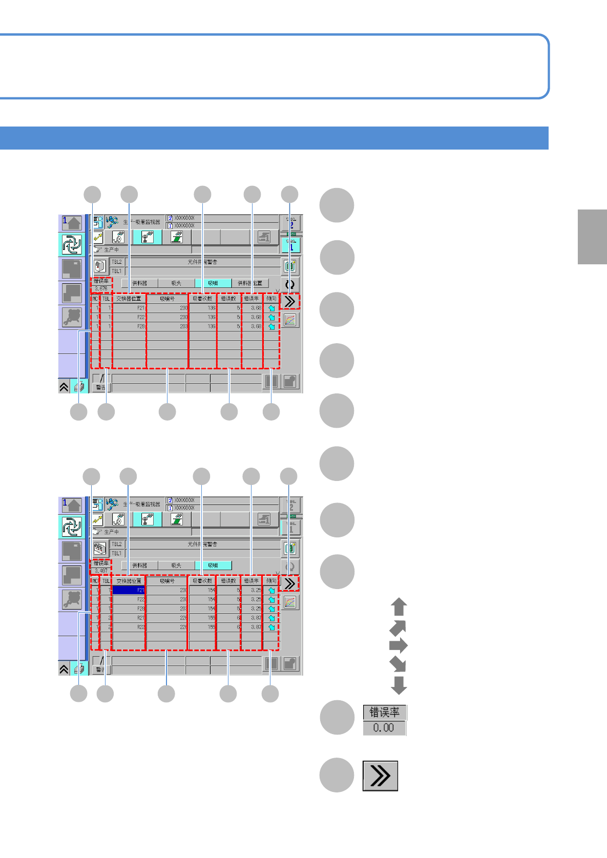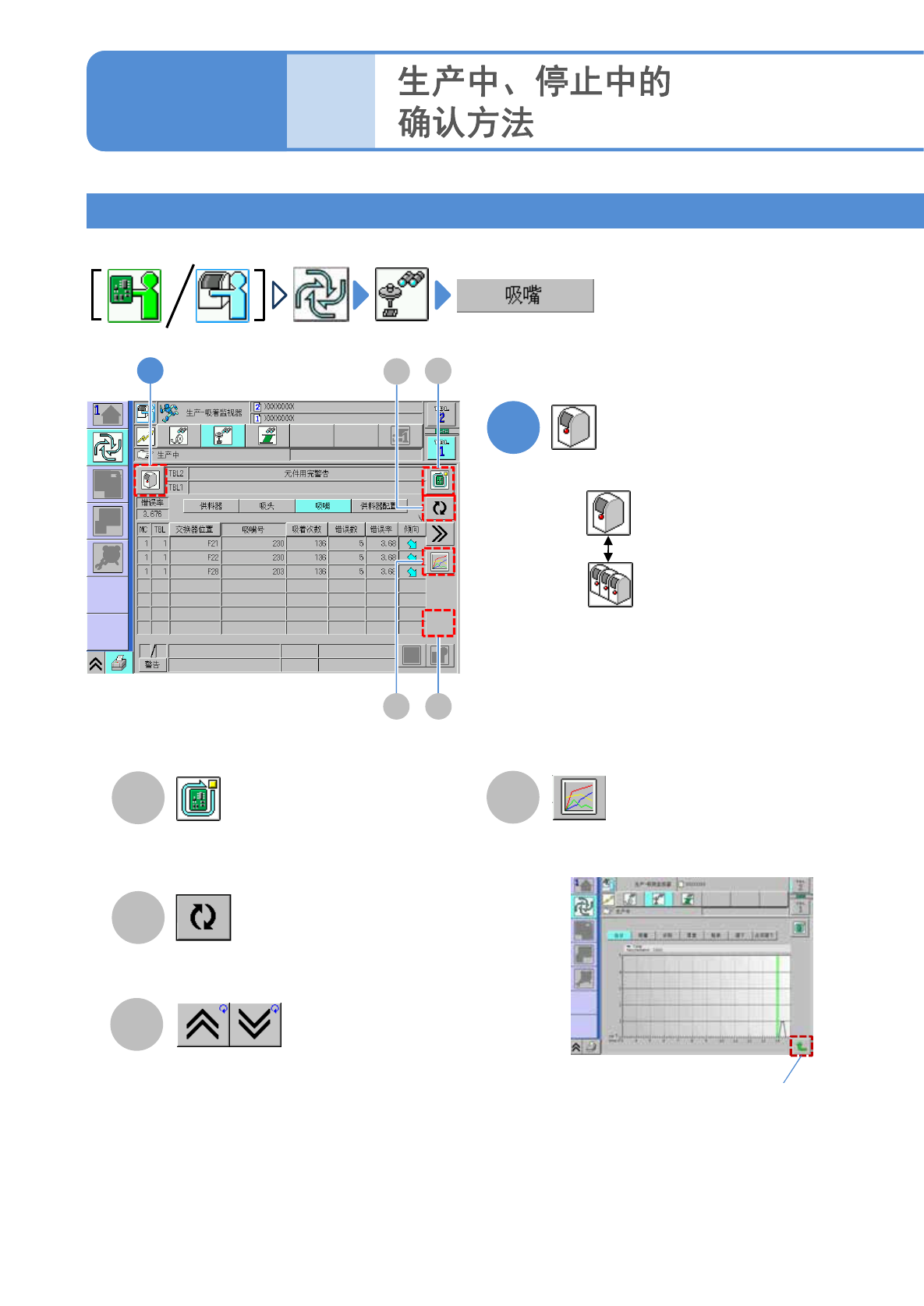 NPM-TT2 EJM1EC-MB-03O-00 吸嘴的吸着状况 6 操作篇 3 - 2 - 1 3-2-1 -11 生 产 信 息 ●显示吸嘴交换器内的吸嘴吸着状况 。 生产中的基板在生产后,再停止生产 。 ( → P.3-1-2) 更新为最新信息。 显示前后画面。 ●所选择的吸嘴在 1 小时 左右的错误次 数通过图表来显示。 竖轴 : 错误次数 横轴 : 时间 返回 原来画面时 A B D C 1 选择设备单位或者生产 线单位。 :…