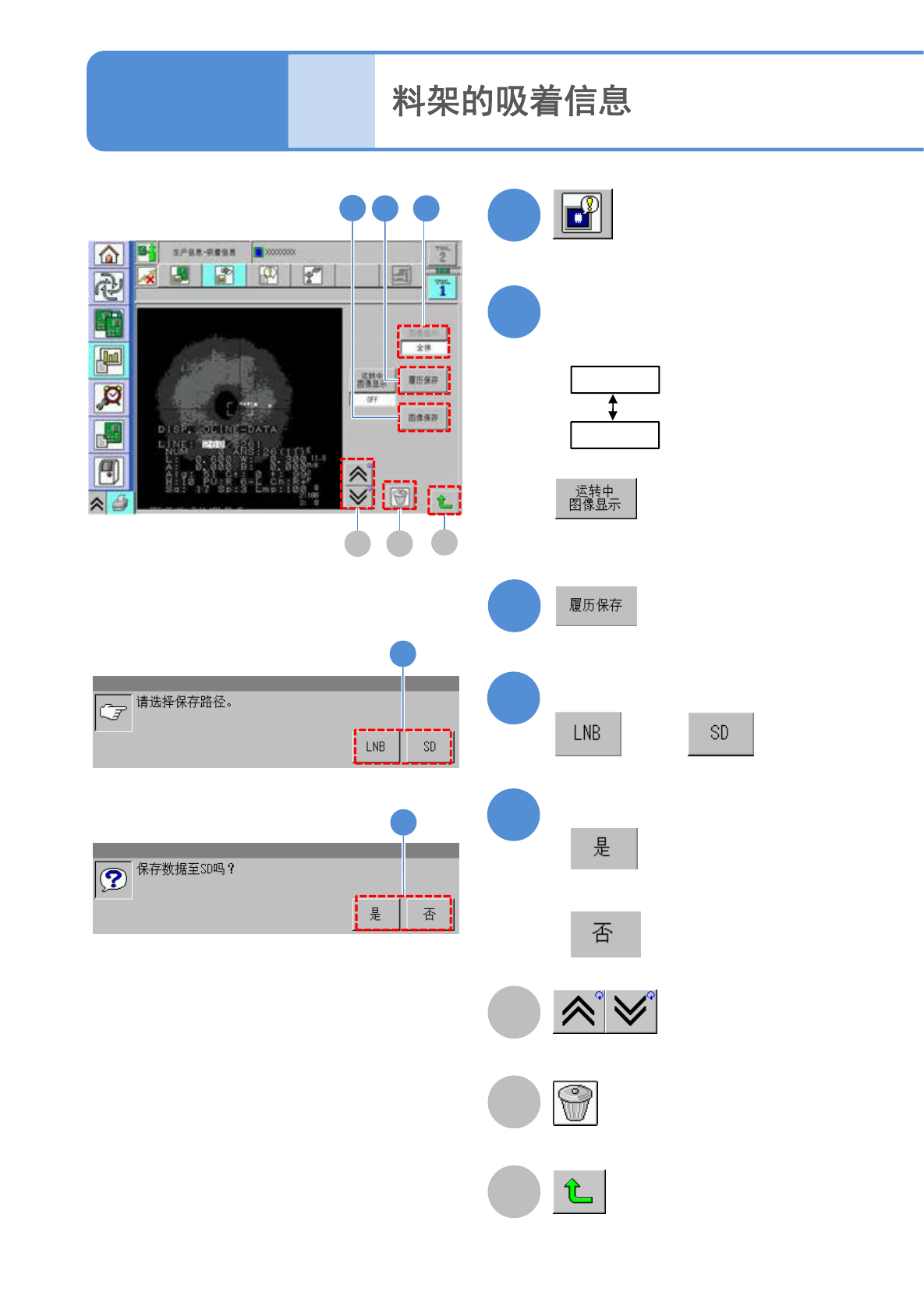NPM-TT2 EJM1EC-MB-03O-00 A B 图像被清除。 切换前后的图像。 C 返回原来画面。 2 3-2-3 -3 ( 显示识别错误的图像信息 ) 全体 指定 5 6 确认提示 或者 确认提示 ■不保存数据时 5 6 生 产 信 息 操作篇 3 - 2 - 3 2 3 选择图像显示 ●所选择的工作台的所 有图像按照最新 顺序显示。 : 显示所有图像。 : 显示在前画面指定的料 架地址的图像。 B C A 4 7 3 4 …