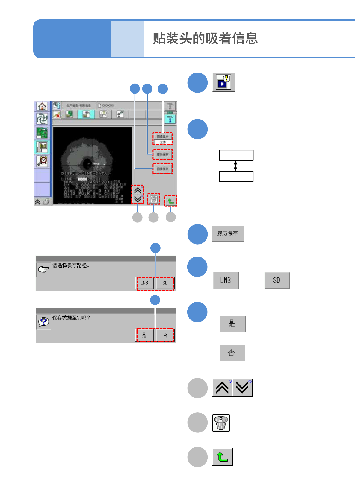 NPM-TT2 EJM1EC-MB-03O-00 生 产 信 息 操作篇 3 - 2 - 4 3-2-4 -3 2 4 A B 图像被清除。 切换前后的图像。 C 返回原来画面。 5 6 确认提示 或者 确认提示 ■不保存数据时 5 6 2 ( 显示识别错误的图像信息 ) 全体 指定 3 选择图像显示 ●所选择的工作台的所有图像按照最新 顺序显示。 : 显示所有图像。 : 显示在前画面指定的料 架地址的图像。 B C A 3 4 7