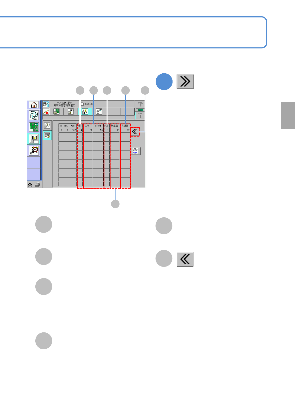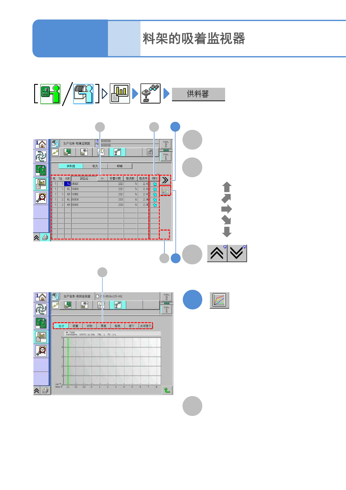 NPM-TT2 EJM1EC-MB-03O-00 3-2-8 -2 A B C D 返回原来画面。 X [mm]/ Y [mm] 发生错误的坐标。 E F 趟 发生错误时,料架和基板之间的往返 次 数。 PCB 发生错误的往返工序内的实装顺序。 ●基板是 1 片时 显示为 0 。 ●基板是 2 片时 0: 第 1 片基板 1 : 第 2 片基 板。 判定値 真空错误判定値。 (8BIT 色彩显示 ) 实测值 真空实测值。 (8BIT 色…