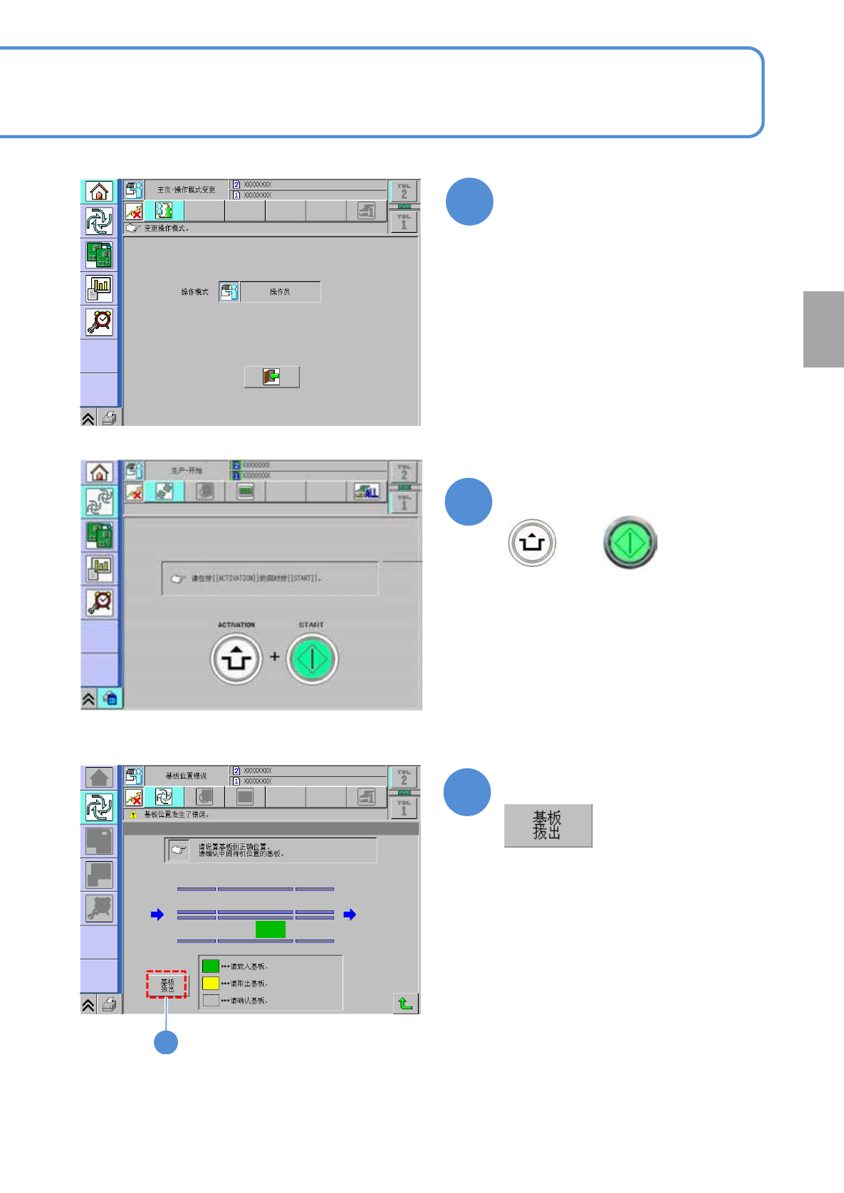 NPM-TT2 EJM1EC-MB-03O-00 3-2-12 -3 生 产 信 息 2 6 操作篇 3 - 2 - 1 2 ( 将删除错误发生位置的基板信息 ) 7 ( 返回到生产准备动作画面 ) 8 + ● 完成了基板抽取作业。 ( 开始生产 ) 6 7 8