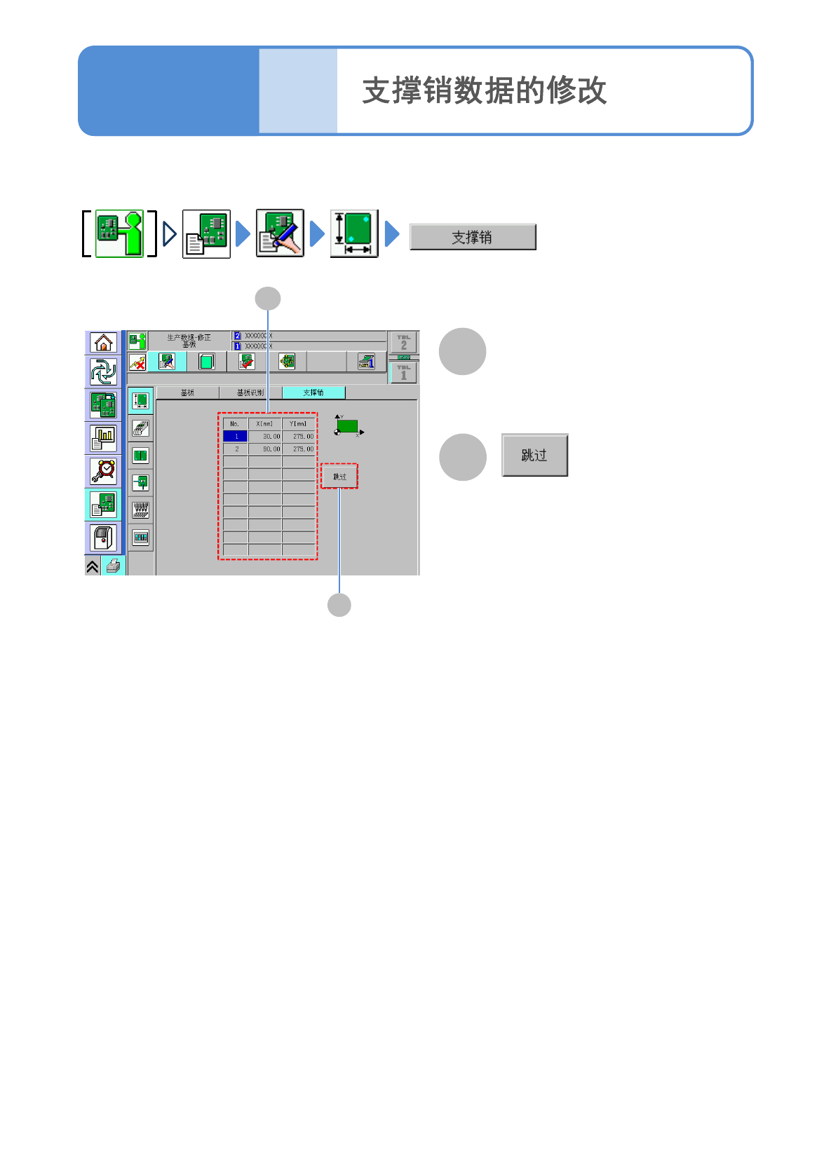 显示支撑销的配置坐标(X,Y)。配置坐标