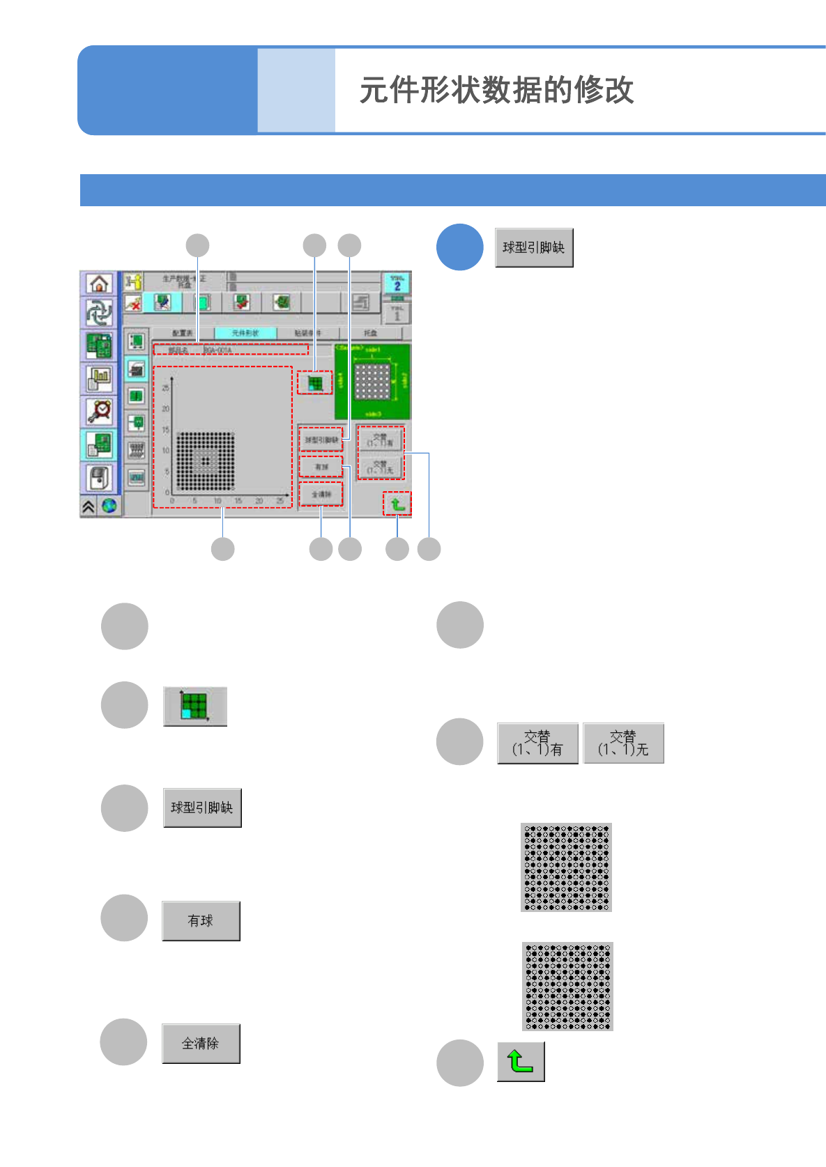 NPM-TT2 EJM1EC-MB-04O-00 4-1-8 -12 ■设定坐标范围的画面 ■设定焊锡球脱落位置的画面 ■设定有焊锡球位置的画面 I J J 返回 的画面。 4 I 设定坐标的表示范围 ● 1 个格子表示有 625(25x 25) 个焊 锡球 L J K N J M 设定焊锡球脱落的开始位置和结 束位置 K L 设定有焊锡球的开始位置和结 束位置 N O ●在表 以「○」记号来表示。 F ●在表 以「●」记号来表示。 F…
