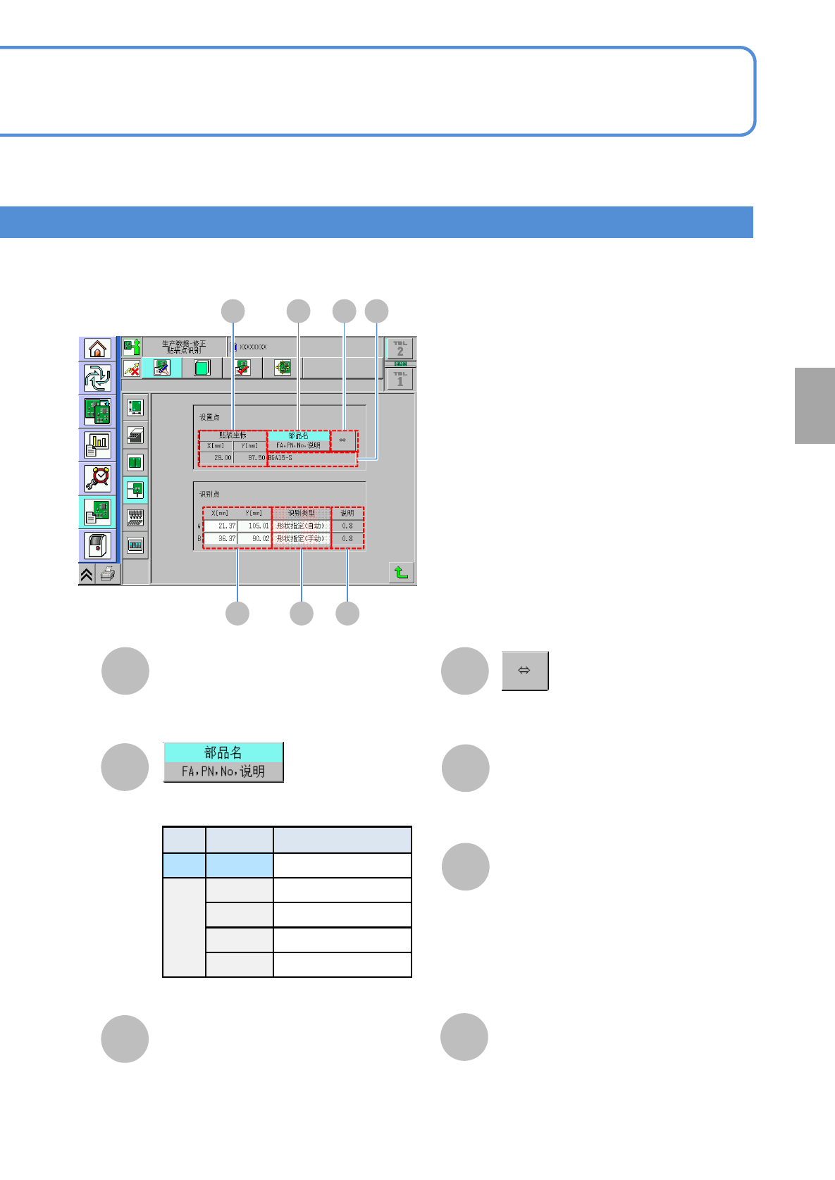 NPM-TT2 EJM1EC-MB-04O-00 4-1-13 -4 A 贴装坐标 E X[mm]/Y[mm] A B D E F G 识别类型 F 说明 G C B 元件 /F A,PN,No, 说明 D C 较长的元件名称,滚动此键可显示。 识别标记的 X/Y 坐标。 各识别标记的识别方式。按「类型」 栏, 会显示各识别标记的形状设定画面。 ( → P.4-1-3) 在 DGS 所设定的识别标记的说明。 显示所选择的…