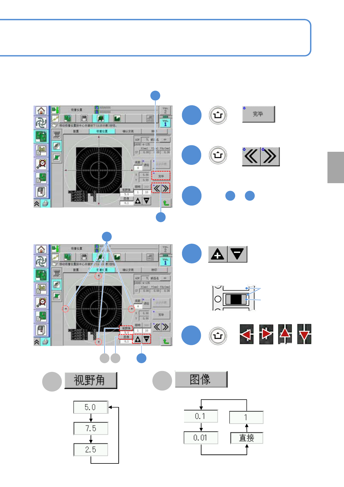 NPM-TT2 EJM1EC-MB-04O-00 4-2-8 -2 5 5 + 6 4 + ( 数据被保存 ) 选择下一台料架。 4 重复 的操作 5 3 ~ 7 ■手动校正时 调节亮度,使凹处的图像清晰可见。 7 8 + 8 凹处的中心 ( 吸着位置 ) 和十字线中心保 持一致。 调整视野范围。 切换图像的移动量。 B C 凹处 元件 B C