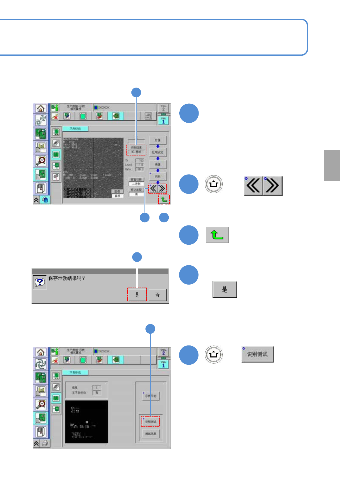 NPM-TT2 EJM1EC-MB-04O-00 17 确认提示 15 再次确认测试结果时 ( 显示 的 测试结果 ) 15 1 1 14 确认识别结果后 16 ●可以转移到其他画面 。 16 4-2-10 -5 17 + 生产数据 校正 3 操作篇 4 - 2 - 1 0 14 TH : 阈值 Level : 亮度 Rate : 像素比率