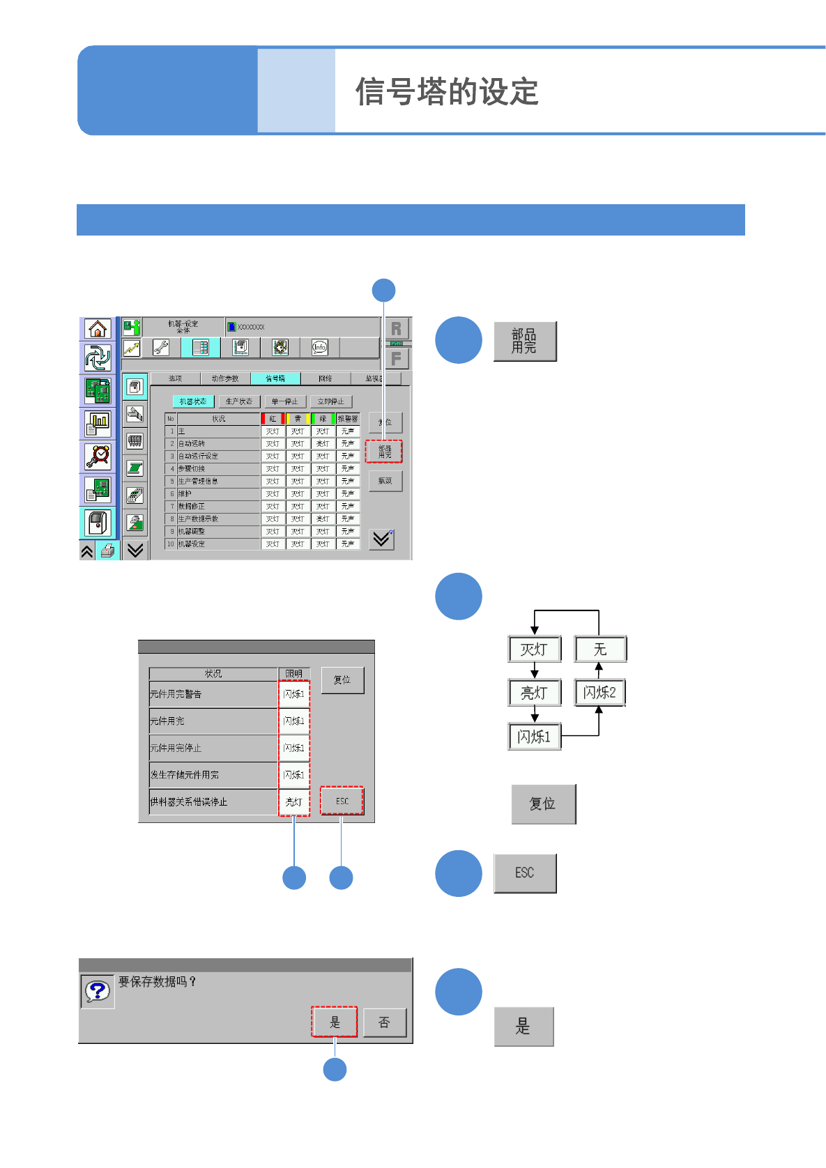 NPM-T T 2 EJM1EC-MB - 05O-01 单 元 设 定 2 5-1 -3 -3 操作篇 5 - 1 - 3 元件用完 ●根据元 件用完 的各种 状态来设定工 作台指 示灯。 2 3 3 ( 返回原来画面 ) 1 2 选择各状况指示灯的设定 4 ■按下一个操作键 确认提示 ■设定为 本公司的 标准 规格时 ( 被初始化 ) 4 1
