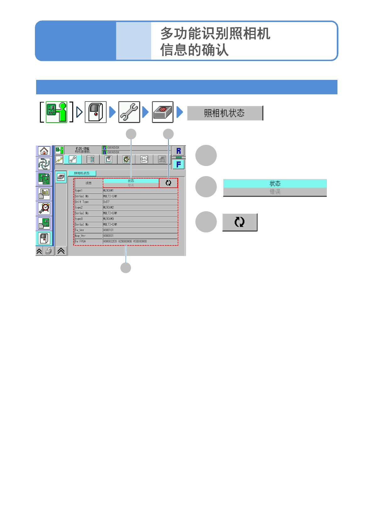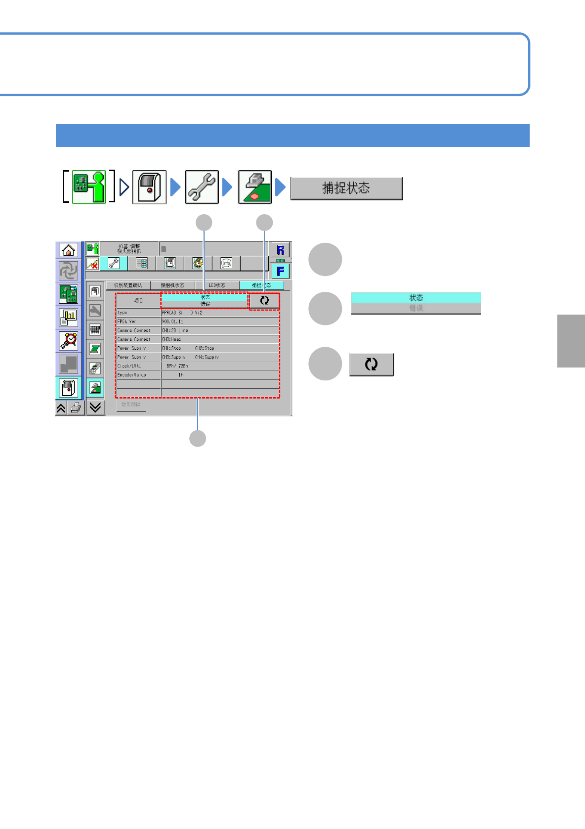 NPM-T T 2 EJM1EC-MB - 05O-01 5-2- 1 1 -1 单 元 调 整 操作篇 5 - 2 - 1 1 确认照相 机 的状 态 A B C 各项目的状态和错误 更新为最 新信息 。 可切换显示的种 类。 A B C