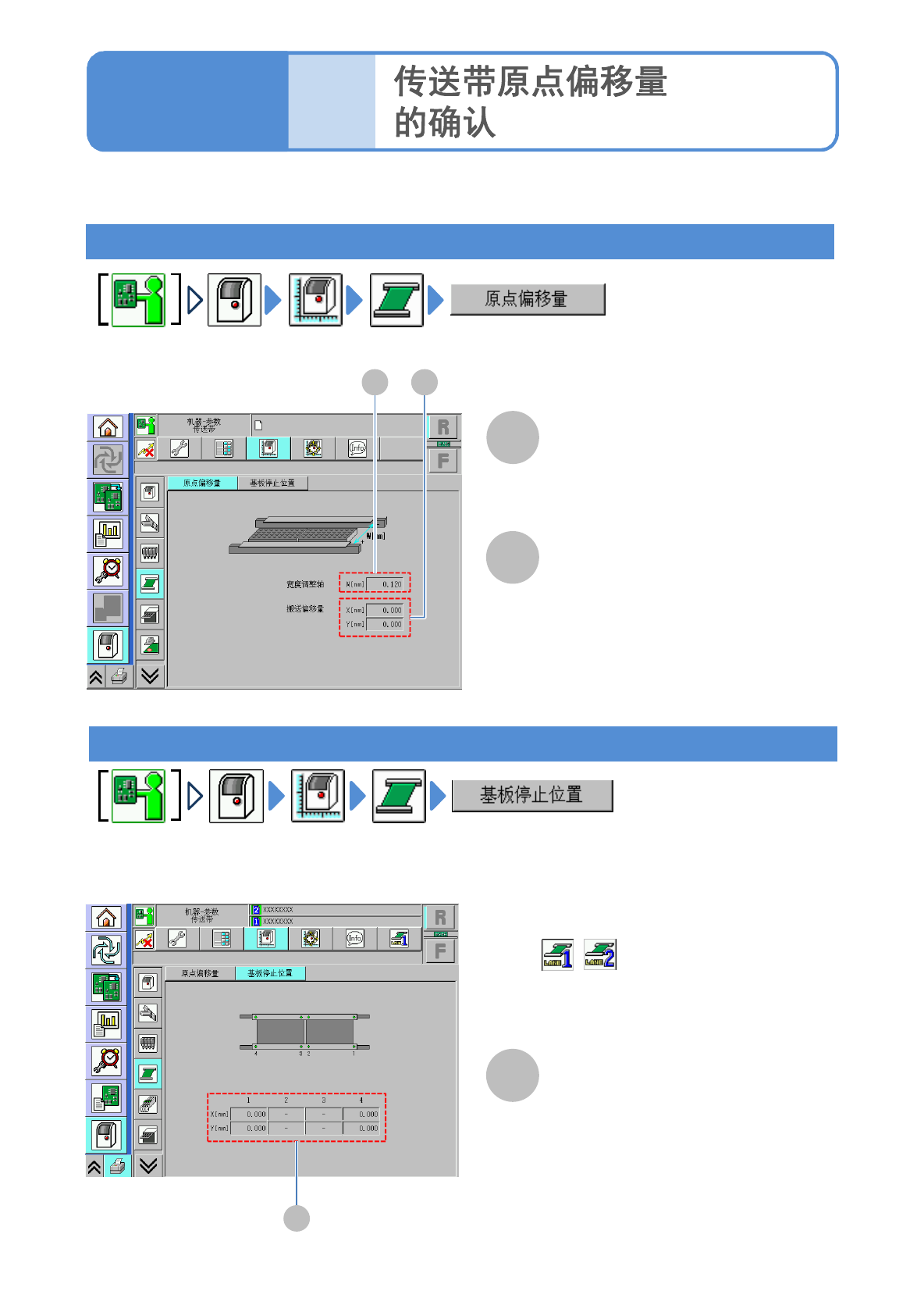 确认传送带的原点偏移值(校准的结果)和基板停止位置的偏移值。