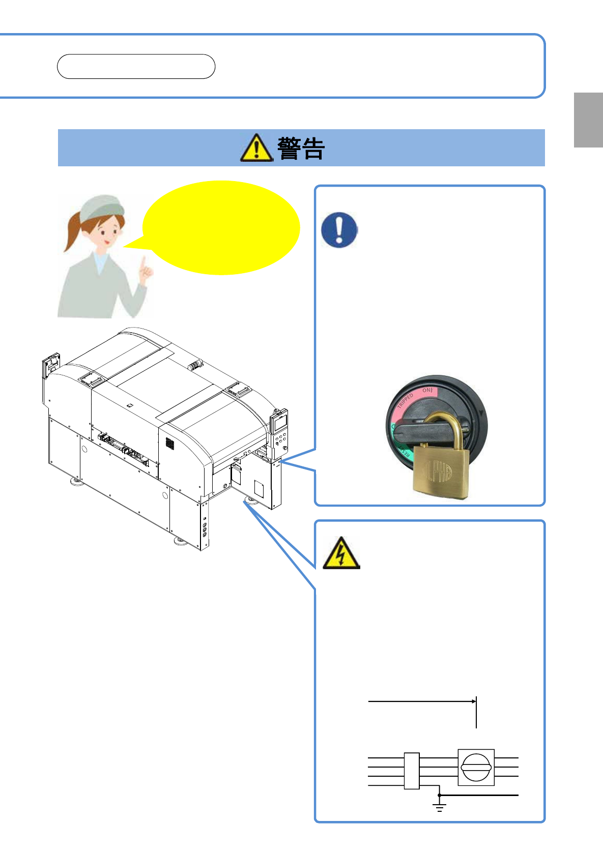 NPM-TT2 EJM1EC-SF-01N-01 未经专门培训者请勿 进行操作、调整、修 理 ( 错误操作、错误调整、错误修理可能造成 受伤 ) ●培训情况请与本公司 联络。 正确安装地线 ( 故障或漏电时,可能触电 ) ●请与专门的电力公司联络。 有电气贯通的部分, 请勿用针类金属等导电体碰触 ( 可能触电 ) ●连接器或端子等的通电部 小心高温 ( 可能烫伤 ) ●贴有此标记的警告标 牌部分,可能是高 温状态。 ●运转停止后,也有可…