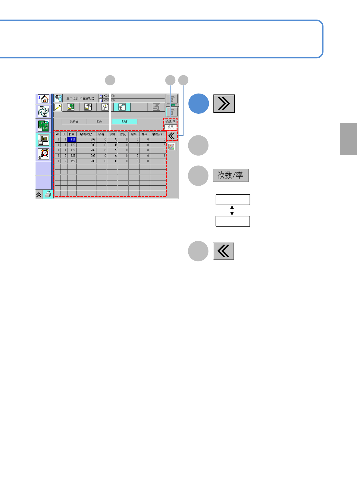 NPM-TT2 EJM1EC-MB-03O-00 3-2-1 1 -2 2 ( 显示错误的详细信息 ) A B 返回原来画面。 C 选择表示的种类。 次数 率 各贴装头的吸着信息 ( → P.3-2-1 -12 ) A B C