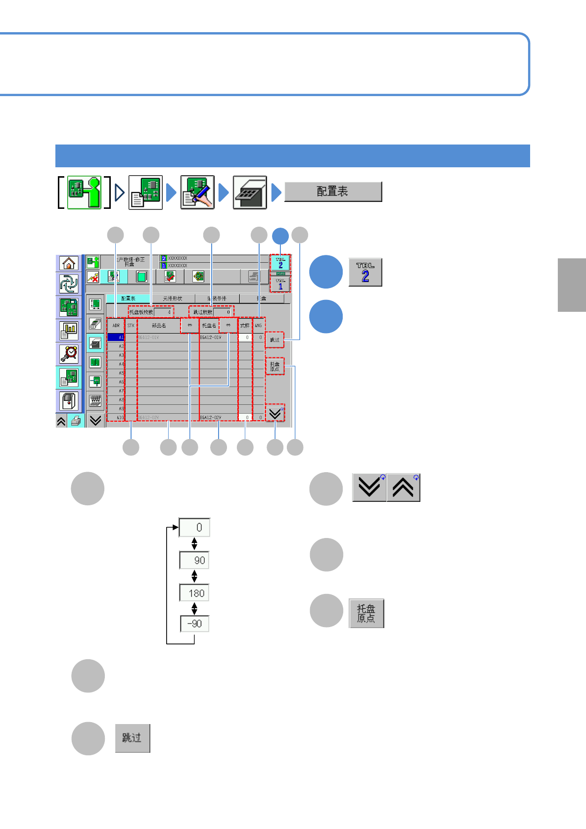 NPM-TT2 EJM1EC-MB-04O-00 I 式样 J ANG( 角度 ) K 将光标所示的数据设定为跳过。 ( 成为无效不进行实装 ) 托盘供料器 C D E A F M B I J L 选择元件的供给角度。 元件的吸着角度。 L 显示前后画面。 托盘名 M 4-1-6 -2 1 1 2 修改画面上的数据 ●轻触画面,显示输入画面。 K N N 显示托盘原点的窗口。 ( 当在一个托盘板上设置多个相同种类的 托盘…