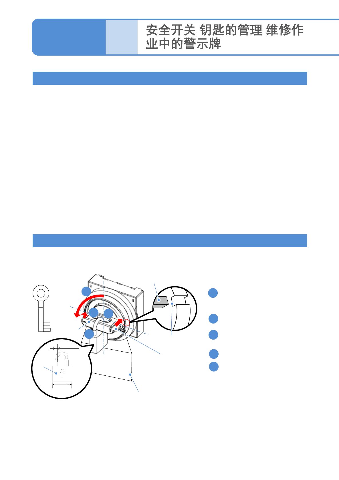 NPM-TT2 EJM1EC-SF-01N-01 安全管理 / / 1-3-1 -1 安全开关 钥匙的管理 设备安全盖内有安全开关,若在自动 生产中不小心打开安全盖, 设备将停止,以确保操作员的安 全。 各使用说明书中有「把主电源开关设置 为 OFF 」的表示文的部位, 都需要钥匙。经过培训的工 程师,请根据 客户的管理基准,管理 钥匙。 ■主电源开关的上锁方法 将手柄向左旋转,调整到锁牌到所 指标记的位置。 按下锁牌。 按下锁牌的状态…