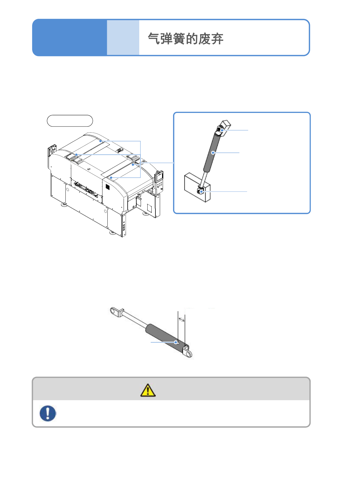 气弹簧使用于安全盖的打开和关闭。气弹簧中存有高压气体,如果不经处理就废弃会十分危险。废气时请必须