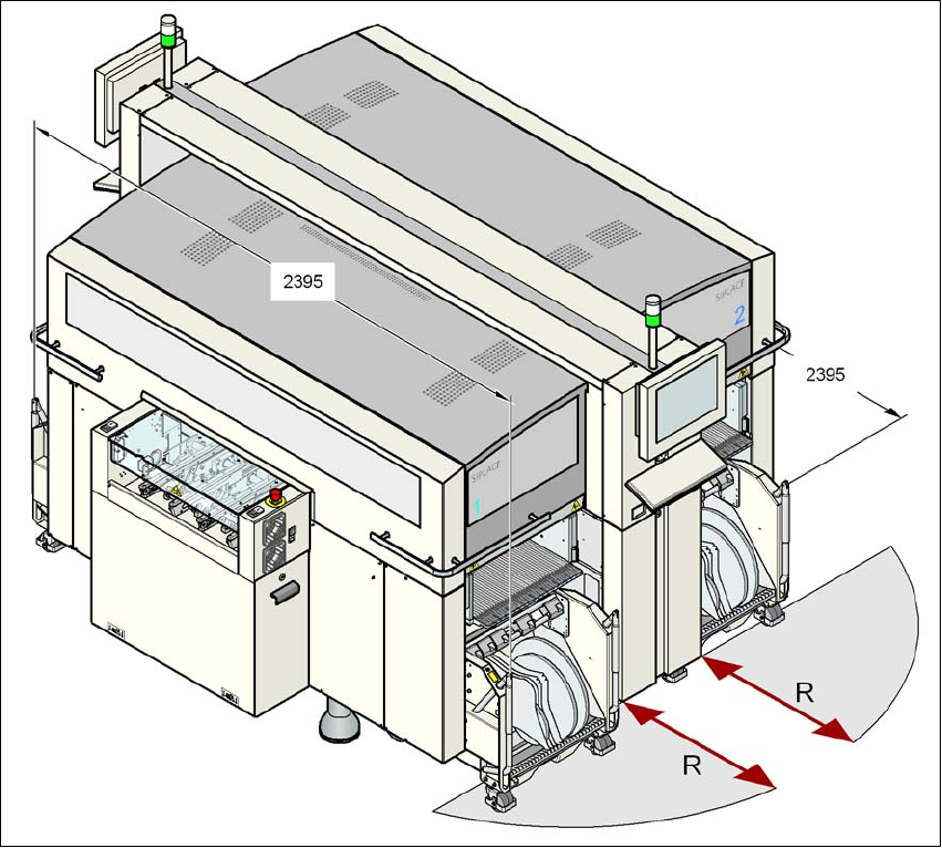 Dane techniczne automatu Instrukcja eksploatacji SIPLACE seria X Wymiary gabarytowe i ci ęż ar Od wersji oprogramowania SR.70x.xx Wydanie 01/2011 116 3.3.4.3 Odst ę p manewrowy wózka na podzespo ł y w automacie X3 3 3 Ry…