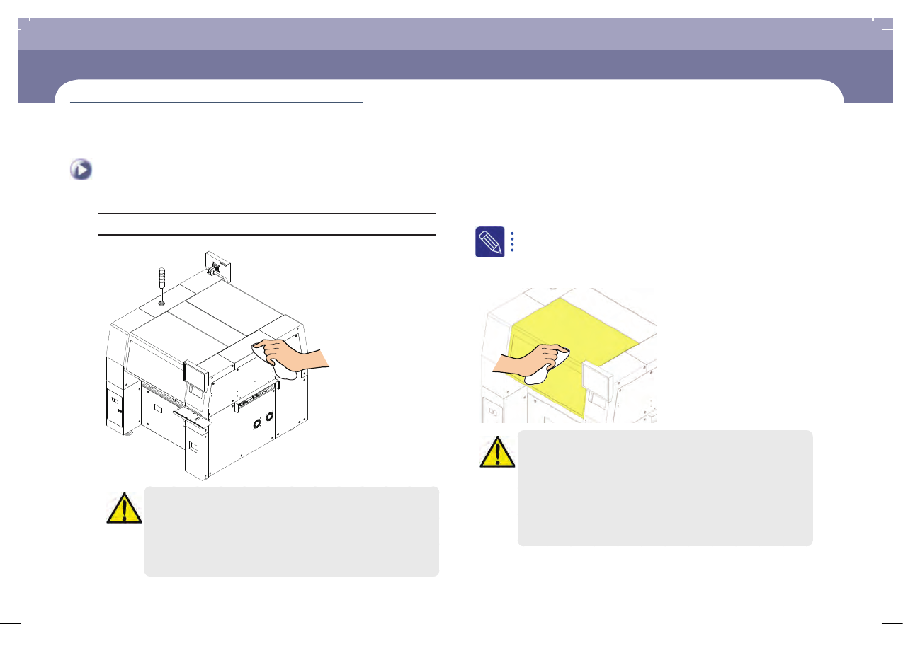 每月检验 Chap ter 5 Fas t Chip Sh oot er SM 471 PLU S Ma in ten an c e Ha nd b oo k 5 -2 1 清扫护盖(Cover) 为了清除盖子的异物或污迹而清扫盖子。 维护工 具 干净布、酒精、 Heavy Duty Staticide # 2005 、# 2001 注 意 使用酒精或乙醇擦拭设备护盖时、必须注意避免酒精或乙醇沾到粘贴在 设备上的贴纸。 否则、粘贴在设备…
