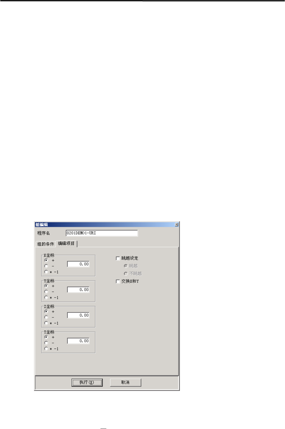 2.程序的制作和编辑 2-68 程序编辑工具 组编辑 【菜单】 程序编辑>程序编辑工具>组编辑 将贴装步骤分成特定的组,进行统一编辑。可以在每个组合基板的编辑中利用。 例如将循环的数据进行循环体展开时,将固有的坏板标识符分配到各个 组合基板中,通过坏板标 识符进行分组,就可以对某一组合基板的 X 坐标进行偏差处理。 ■ 组的条件 对编辑对象的组进行指定。 【项目】 元件代号、参考标识、图像代号、基准标识符的组号、坏板标识符的组号、…