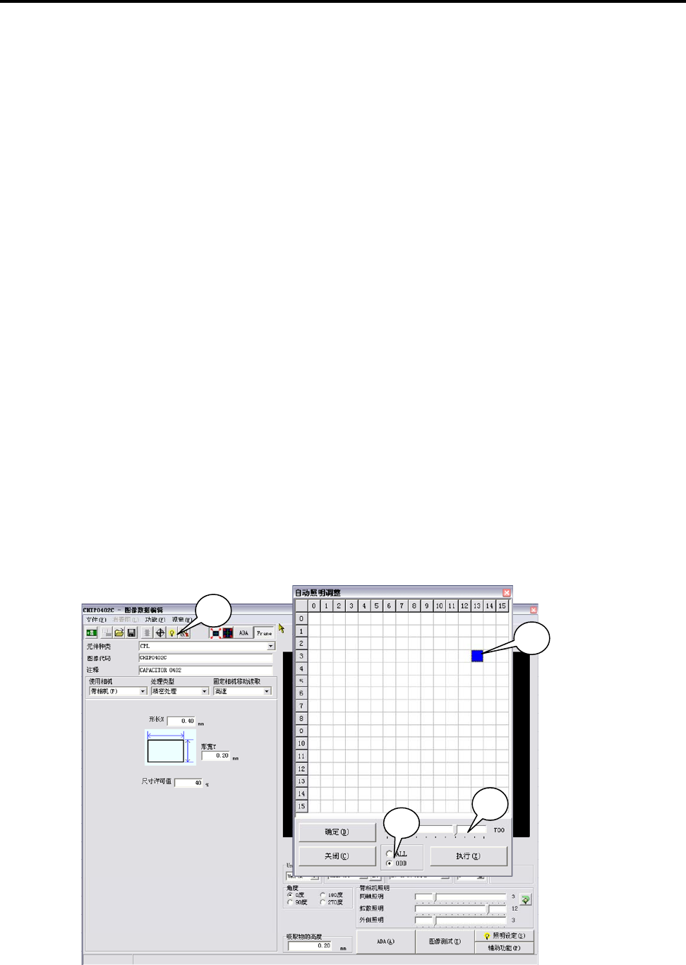【注释】 照明调整功能就是对照明设定进行测定,以保证正确识别被测元件的尺寸。因此图像数据中元件的尺寸和引脚