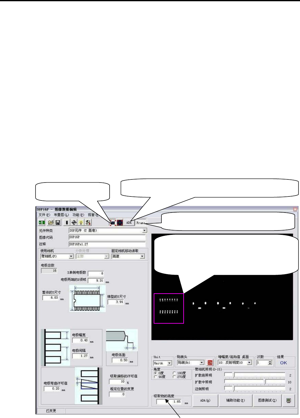 ⑨ 输入后执行图像测试,对[图像数据编辑]画面上将不显示出吸嘴,元件是否鲜明地被显示出