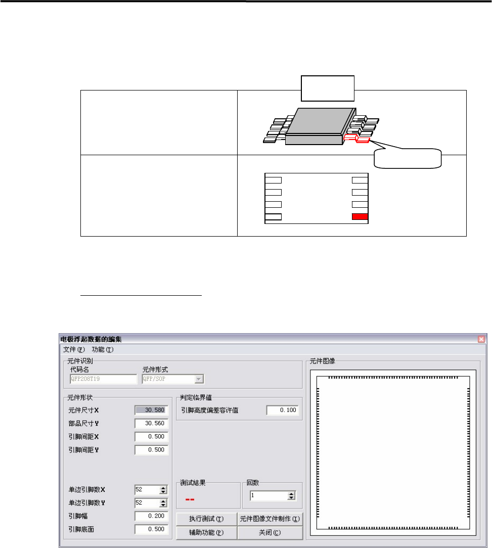 6.检出电极浮起功能 6-9 ■ 元件图像 在电极浮起编辑画面的[元件图像]栏中所显示的元件图像,如果在电 极浮起测量过程中发生错 误时,会用红色将发生错误的引脚显示出来。 注:错误引脚显示为红色,缺脚电极显示为浅蓝色。 ⑤ 对电极浮起测量进行测试。 在必要的项目设定完了之后,请按照以下步骤对电极浮起测量进行测试。 1 点击[元件图像文件制作]按钮,将会显示出元件图像。 按照在[元件形状]栏中输入 的尺寸等数据,制作出元件图像。在此请对…