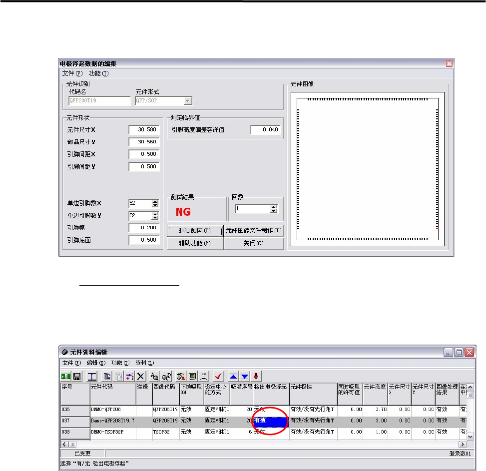 5 下图是在多个引脚 QFP 元件的情况下,引脚高度偏差值超过判定容许值,测试结果为 NG 的实