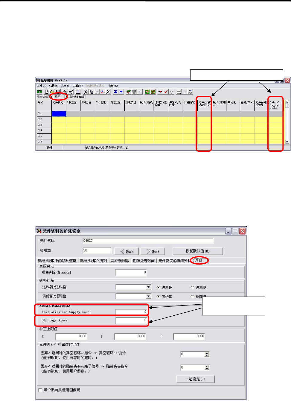 状态,需要输入吸取数据中[初始供给数]和[元件短缺预告数]的值。