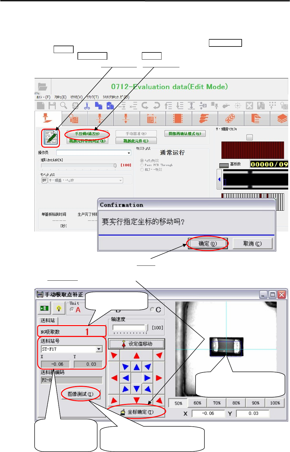 9.生产 9-26 生产中的修正(ST-F/ST-R) 【操作】 ① 在生产中如果发生吸取出错、造成错误停止时,首先,请按下 ALARM OFF 开关 ( CLEAR 开关),停止报警音。 然后,按下 RECOVERY 开关(再次 CLEAR 开关),从错误状态复原。 ② 在生产画面中会出现[修正模式] ,<手动吸取点>按钮将变为有效。 ③ 该画面也将同时显示出来,请点击<确定> 按钮,将检测相机移动到发生吸取出…