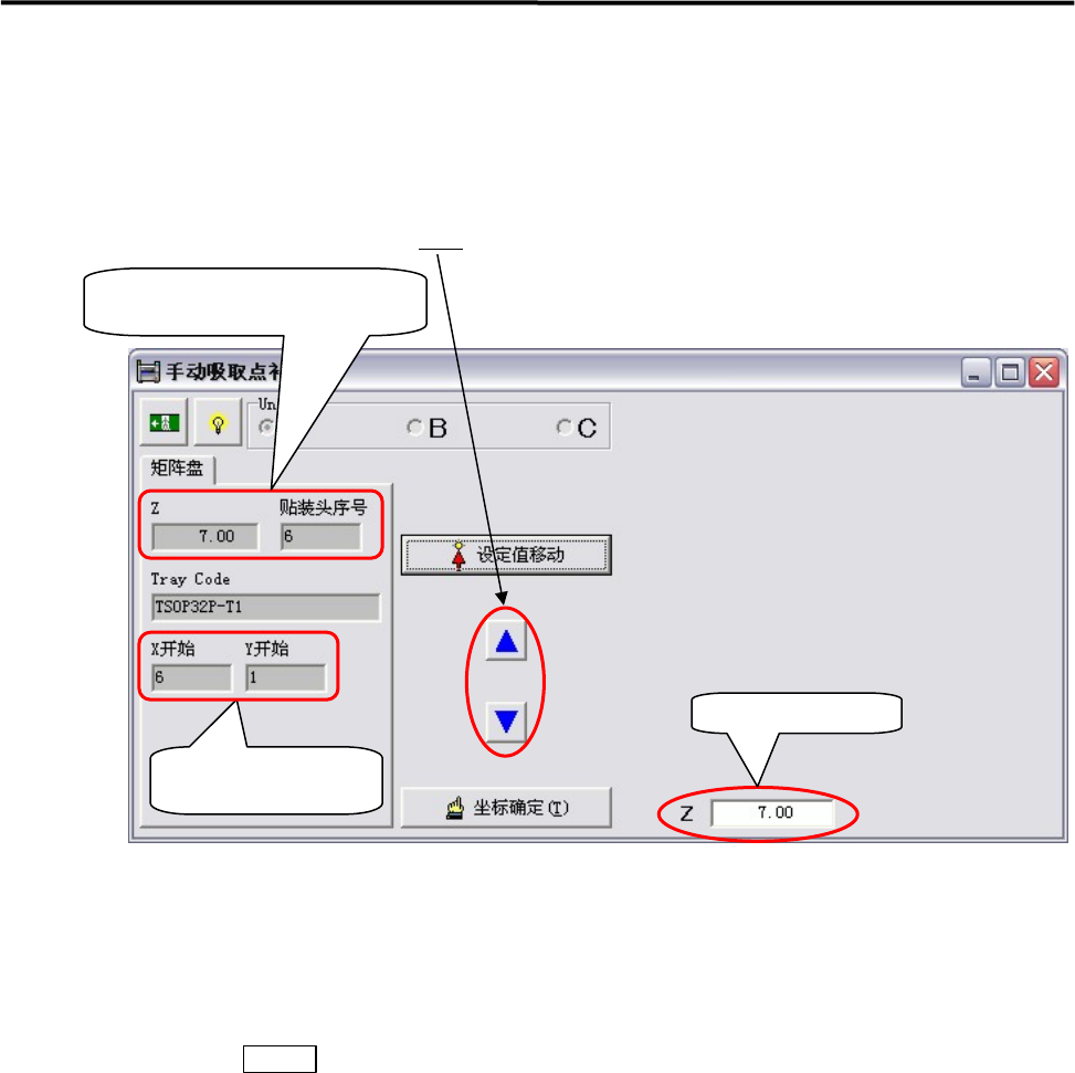 9.生产 9-28 生产中的修正(矩阵盘送料器) 【操作】 ① 当矩阵盘送料器上发生吸取出错的情况时, 在 [指定坐标移动] 实行 OK 的状态下, 会将吸取 出错的贴装头移动到发生吸取出错的矩阵盘口袋内。 ② 下列的检测画面将会被显示出来,请一边观察[Z 坐标的计数]及吸嘴前端与元件上面 的间隙量,一边使贴装头微动 下降,对元件上面进行检测。 【注释】 此时,请不要一下子大幅下降贴装头。 否则,可能会对吸嘴、贴装头、元件造成破损。 当…
