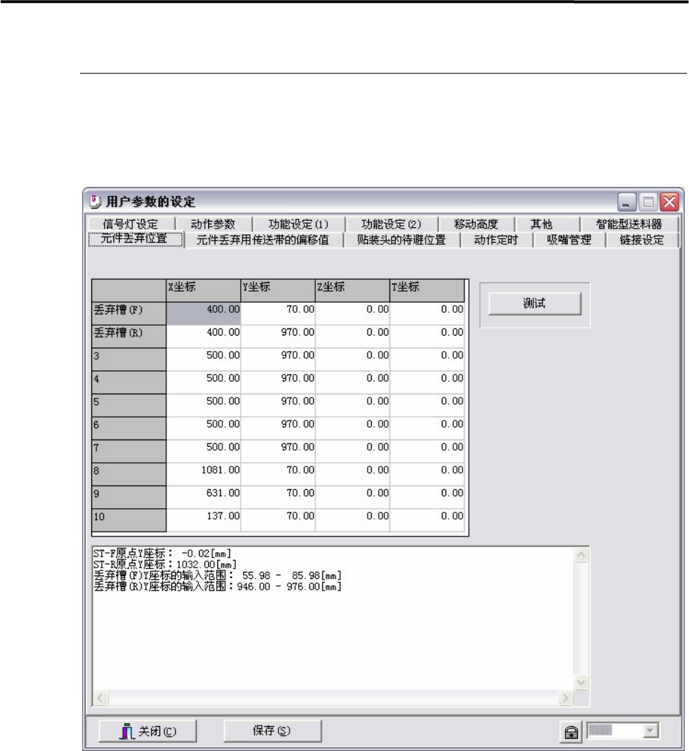 对不良元件的丢弃位置坐标进行设定。丢弃位置可以在 3~10 的 8 个部位进行设定。