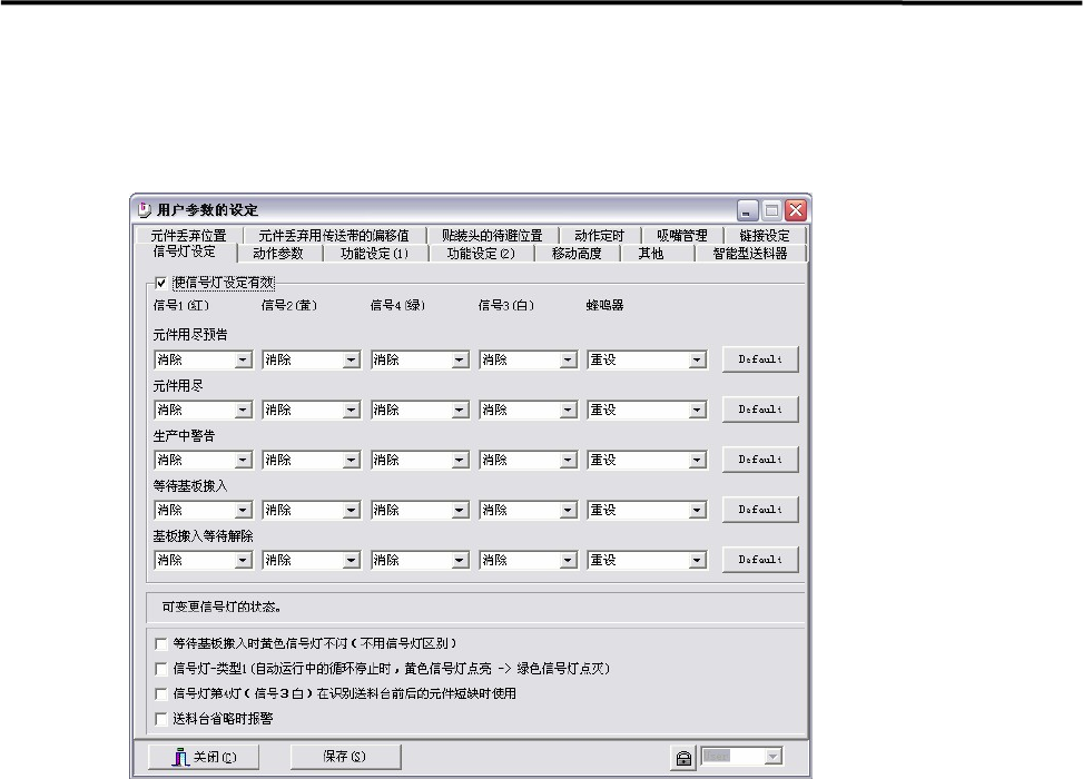11.参数的设定 11-7 信号灯设定 【菜单】 系统>用户参数的设定>信号灯设定 在元件用尽预告、元件用尽、生产中警告、等待基板搬入以及等待基板 搬入解除时,可以对信号 灯和蜂鸣器的状态进行变更。 请选择各个项目的状态,然后点击<保存>按钮。由于设定在系统再 起动之后才变为有效,所以请将贴片机的电源关闭,然后再重新启动系统。 ■ 在等待基板搬入时,黄色信号灯不进行点灭。 ■ 在自动运行中的循环停止时,黄色信号灯…