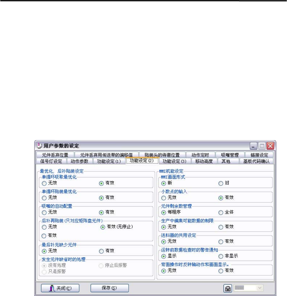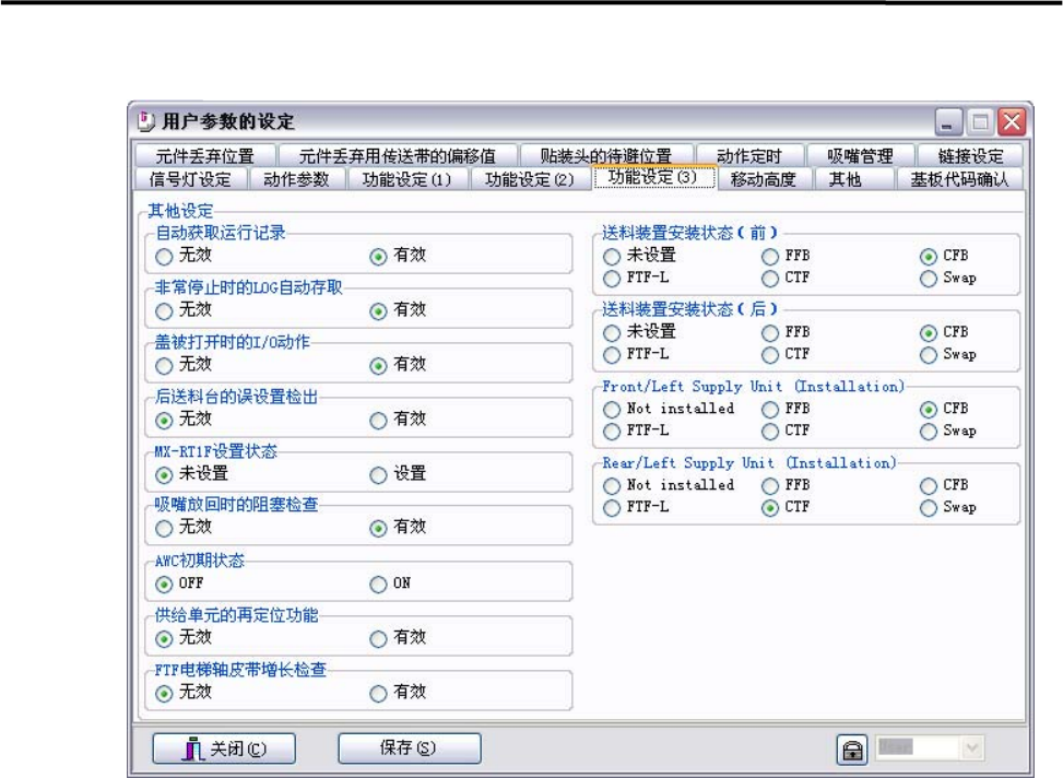 11.参数的设定 11-12 其他设定 37. 自动获取运行记录 38. 非常停止时的 LOG 自动存取 39. 外盖被打开时的 I/O 动作 40. 后部送料台的误设置检出 41. MX-RT1F 设置状态 42. 吸嘴放回时的阻塞检查 43. AWC 初期状态 44. 供给单元的再定位功能 45. FTF 电梯轴皮带增长检查 46. 送料装置安装状态(前) 47. 送料装置安装状态(后) 48. 送料装置安装状态(左前) 49. 送…