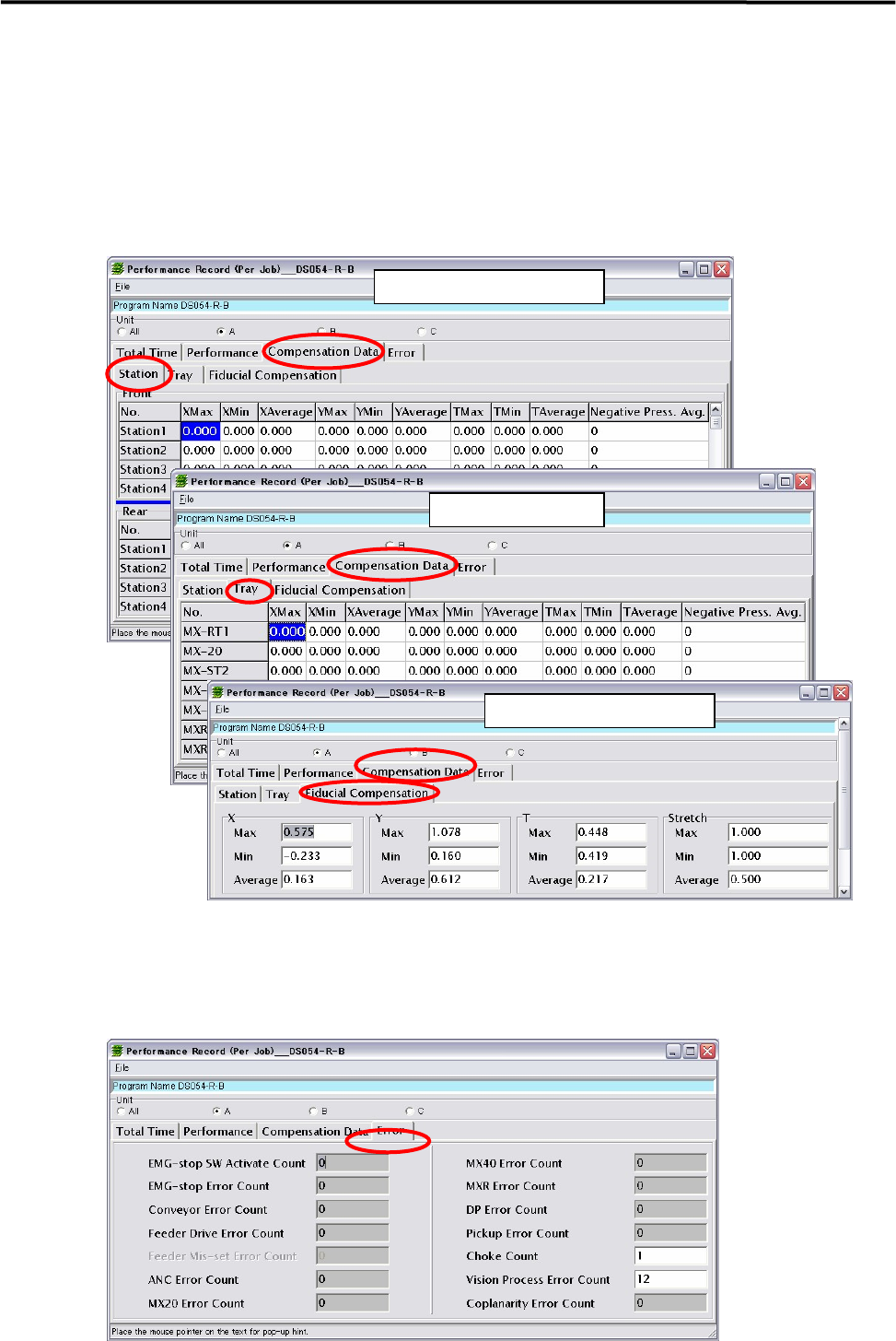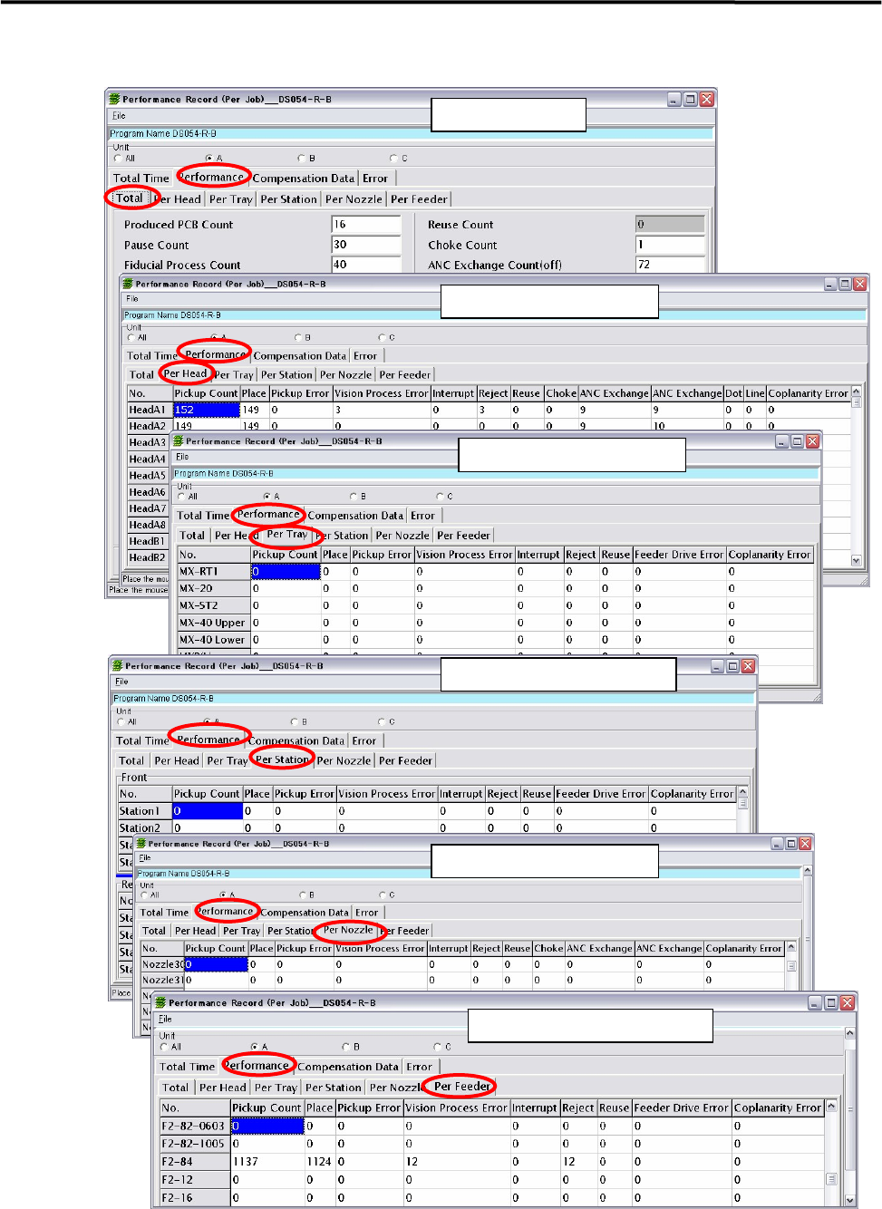 12.管理数据 12-5 ● 实绩管理的画面 实绩管理>全体 实绩管理>每个贴装头 实绩管理>每个矩阵盘 实绩管理>每个送料站 实绩管理>每种吸嘴类型 实绩管理>每种送料器