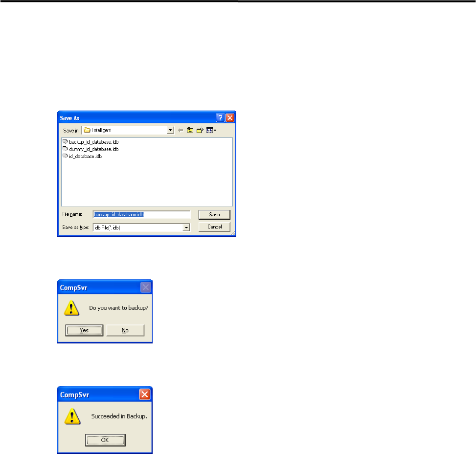 14.智能型送料器功能 14-17 ■ ID 数据库的备份 【步骤】 ① 选择任务栏>文件>「ID 数据库的备份」。 ② 会显示出保存的场所和文件名输入的对话框,请任意设定之后,点击「保存」按钮。 →默认的候补文件名为“backup_id_database.idb”。 ③ 会出现「要备份吗?」的显示,请点击「是」按钮。 ④ 如果备份成功,将显示出成功的信息,请点击「OK」按钮。 【注释】 建议经常对 ID 数据库进行备份。 …