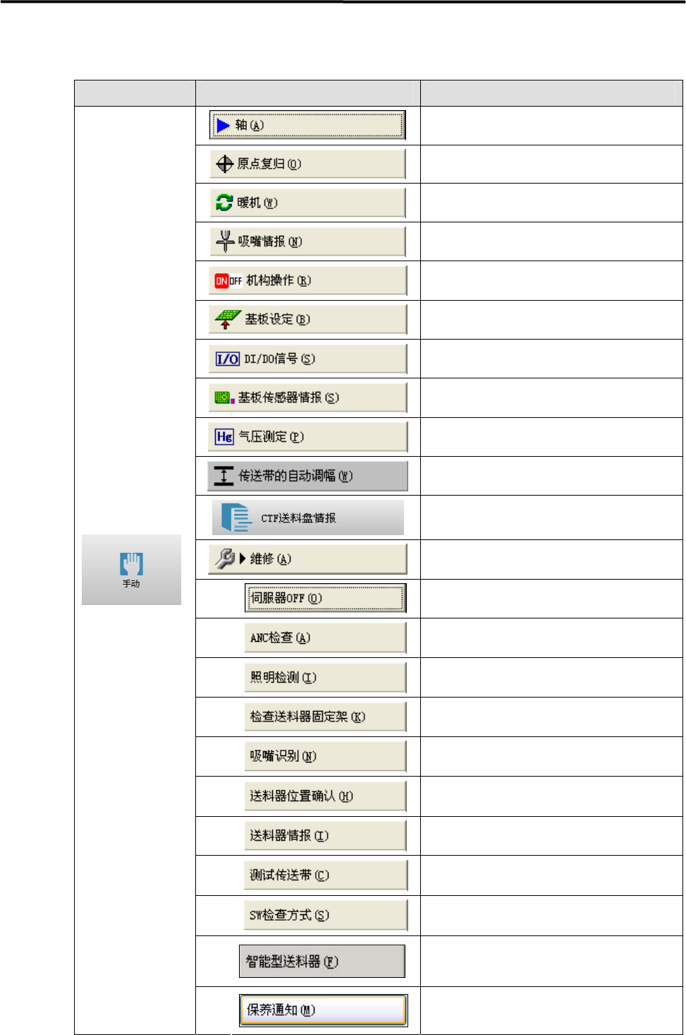 1.概要 1-19 指令内容一览 主菜单 副菜单 内容 打开轴操作画面。通过手动操作也可以 移动各轴。 进行各驱动轴的原点复归。 进行暖机操作。 打开吸嘴情报画面。 打开机构操作画面。可以对空气机器及 送料器进行操作。 使传送带动作,进行基板的安装及搬出 作业。 打开 DI/DO 画 面 。在确认数字的输入/ 输出等情况下使用。 可以确认各基板传感器的反应状态。 可以测定各贴装头的空气压力。 进行传送带自动调幅的轴动作及原点复 归。 进…