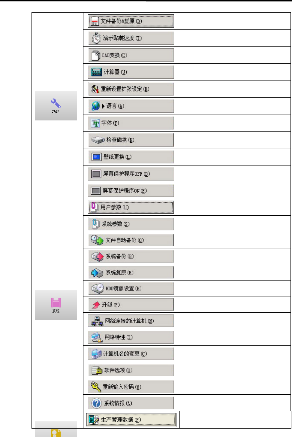 1.概要 1-21 对生产管理数据进行重新设定。 显示出日志(装置及程序运行的记录)。 对密码的设定和可能的作业内容进行变 更。 设定生产计划。 进行操作者姓名的登录和删除。 显示出操作者的作业开始时间、结束时 间。 对从上次计数归零开始到现在为止的生 产基板数进行表示。如果按下<R>按钮, 计数值将会被归零。 终止系统。 【注释】 与选购品功能相关的指令,由于选购品装备状态的差异而有所不同。