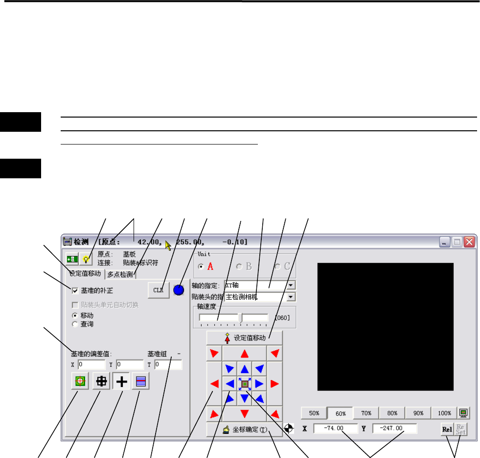 2.程序的制作和编辑 2-12 6.坐标表示区域 显示出正在检测的坐标。此部分根据轴指定的种类进行变化。 轴的指定 显示 XY 轴 X、Y Z轴 Z T轴 T 7.〈Rel/Abs〉、〈Reset〉按钮 按下 〈Rel〉 按钮之后, 如果再按下 〈Reset〉 按钮, 可以将现在的位置 坐标假定为原点 (0.00,0.00 )进行检测。如果再按下〈Ab s〉按钮,就 会会恢复原程序上的坐标值。 8.外侧方向指示按钮 点击贴装头移动方向的…